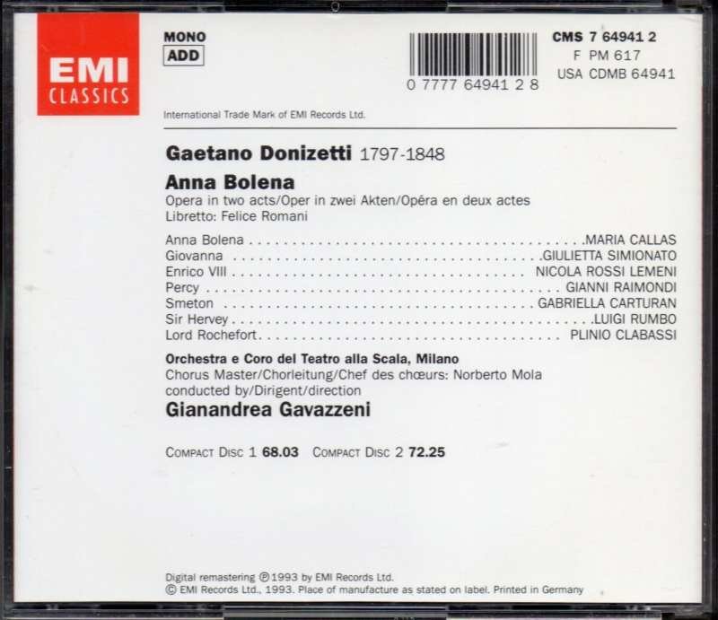 ドニゼッティ:アンナ・ボレーナ ガヴァッツェーニ=スカラ; カラス(S) 他 /L (CMS764941・2CD) 收藏