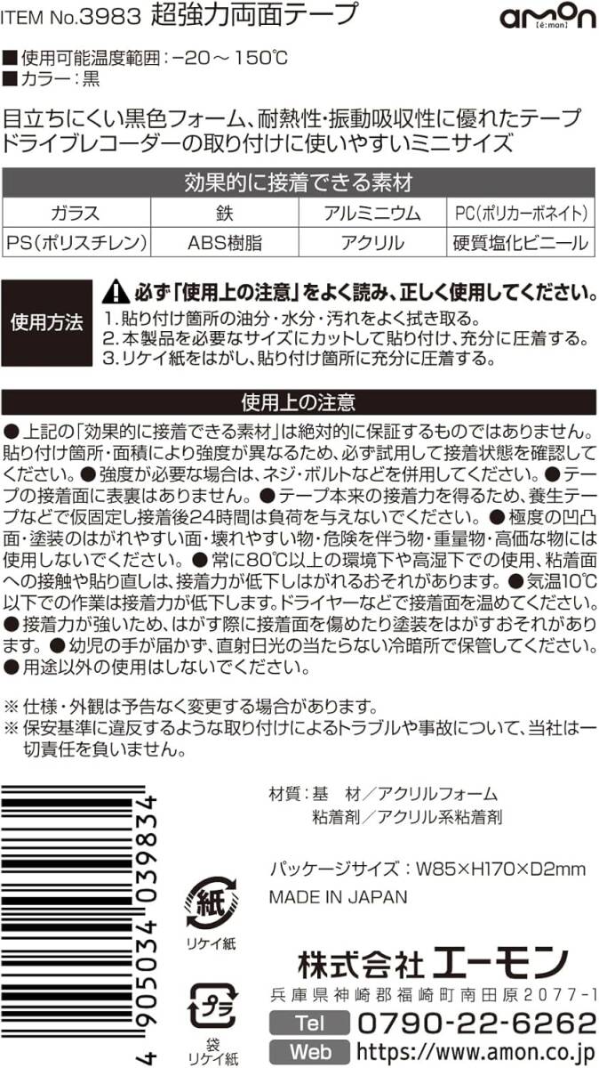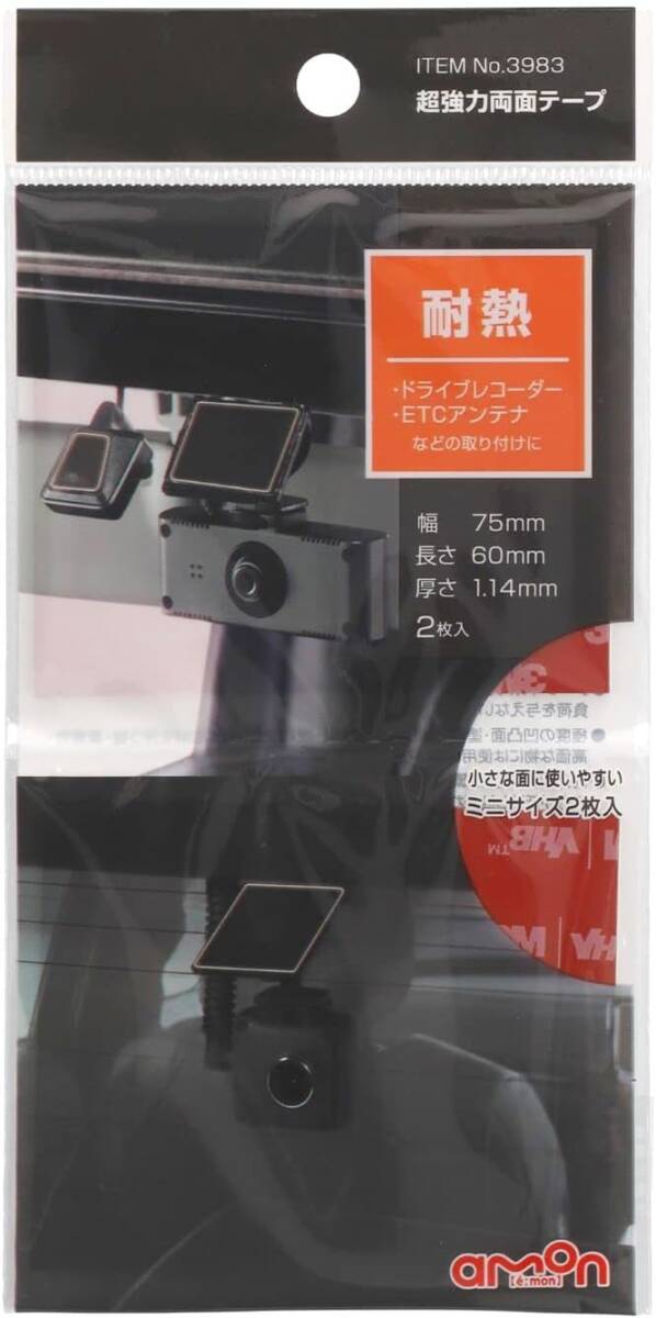 エーモン(amon) 超強力両面テープ (ドライブレコーダー・ETCアンテナなどに) 耐熱 黒 幅75mm×長さ60mm×厚さ1. 收藏