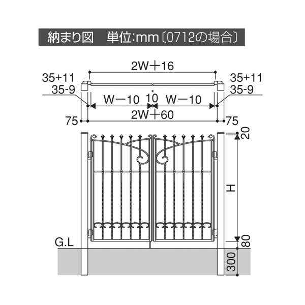 | 仕様・サイズ | 全幅141cm(扉60cm×2)X高さ120cm ▼通常仕様 ・扉の開閉方向:内開き(家側へ開く)仕様 ・打掛け錠 (外/内:簡易錠) | |
