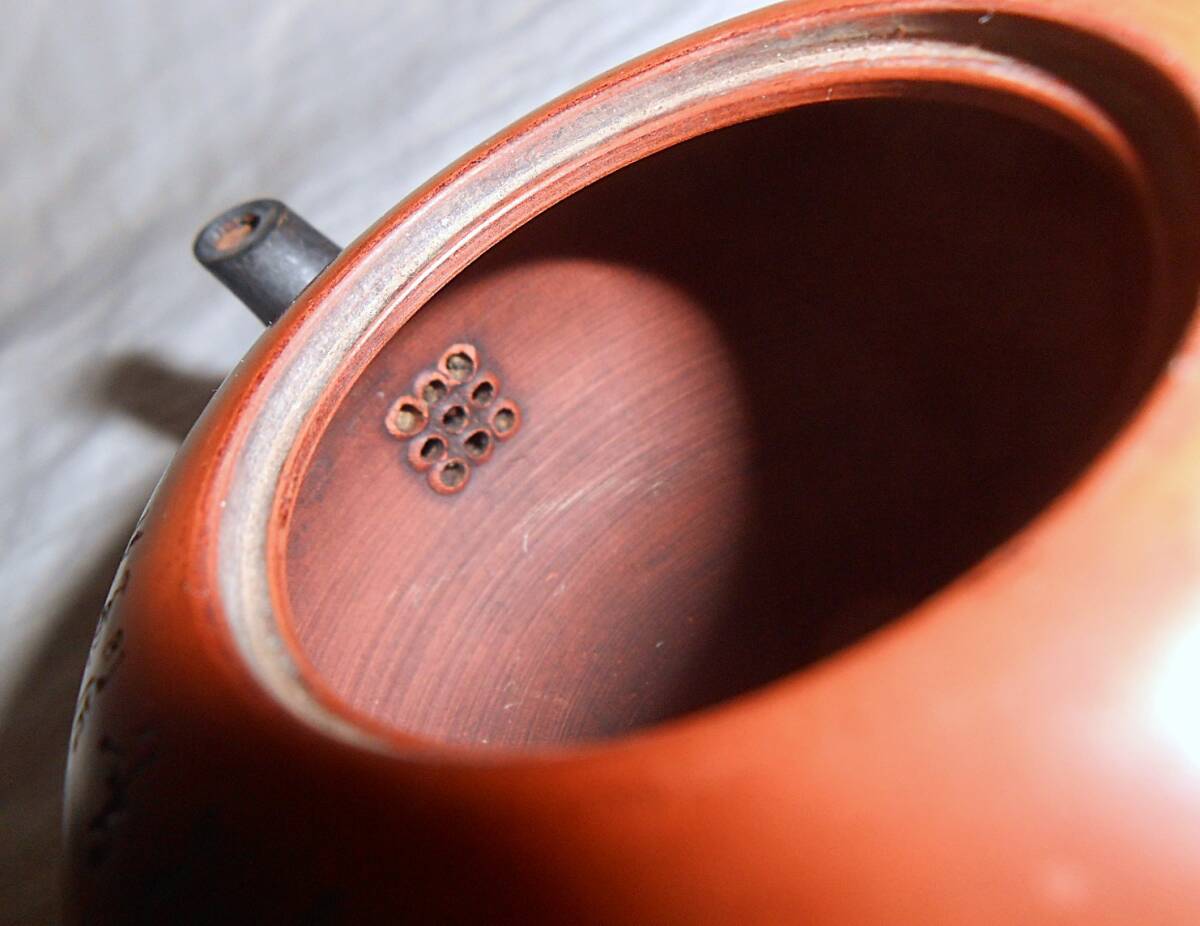 時代を感じる小振りな急須で、側面に彫られた文字に「明治三十九…赤水作」と思われる部分がありますので、120年ほど前に作られたものかと思います。注ぎ口が欠けたためか銀材のような金属が被せてあり、また蓋が2つに割れたのを鎹を用いて継ぎ直していて、蓋の側壁の一部は欠失しています。他にも時代なりの汚れやスレなどはご容赦下さい。側面に彫られた風景や文字は巧みで技量の高さが感じられ、壊れても修復して大事に受け継がれてきたものと思われます。持ち手下部に「赤水造之」と思われる押印があります。摘み上部までの高さ約5,4cmです。