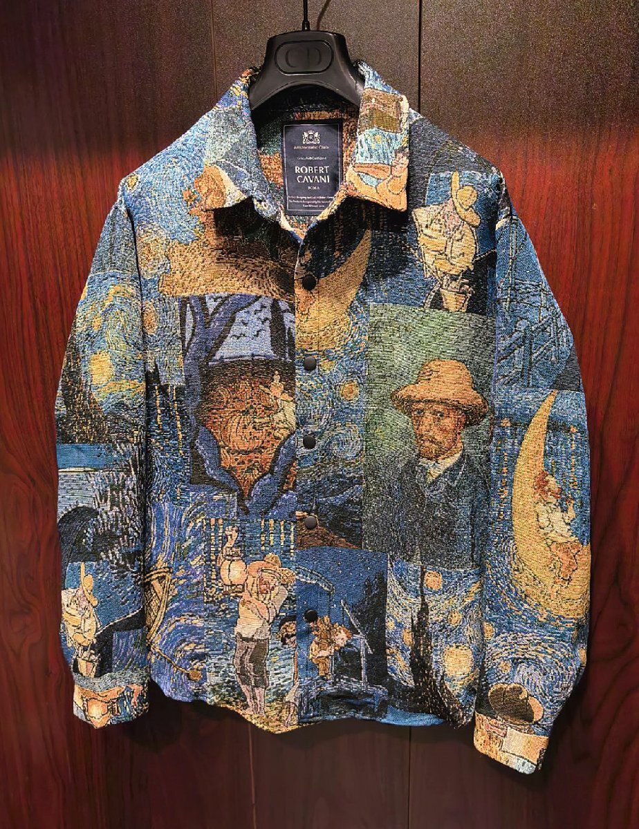 最高級※定価10万◆イタリア・ローマ発*ROBERT CAVANI*高級リネン/麻生地使用・ファン・ゴッホの名作 ・星月夜・シャツ/ジャンパー50/XL 收藏