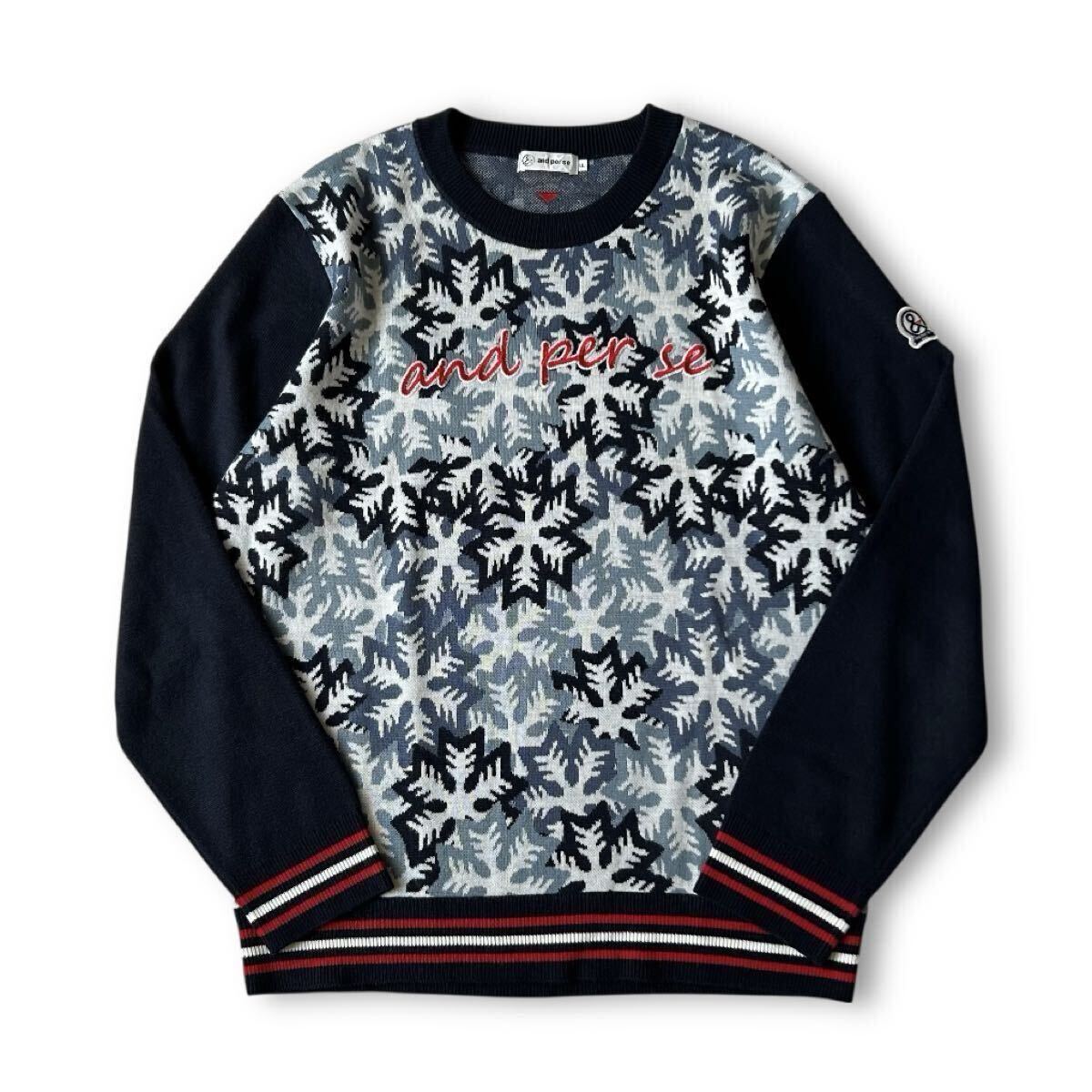 大きいサイズ LL and per se アンパスィ 編み込み 雪柄 ロゴ刺繍 ニット セーター ネイビー 総柄 日本製 メンズ ゴルフ 長袖 トップス 秋冬 收藏