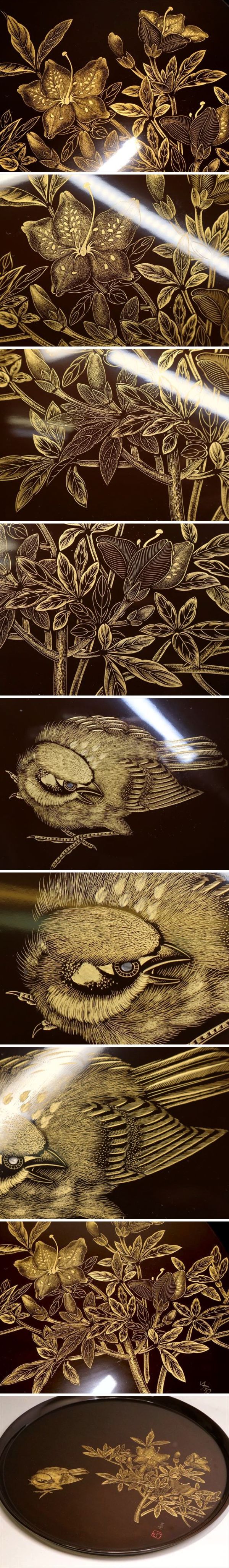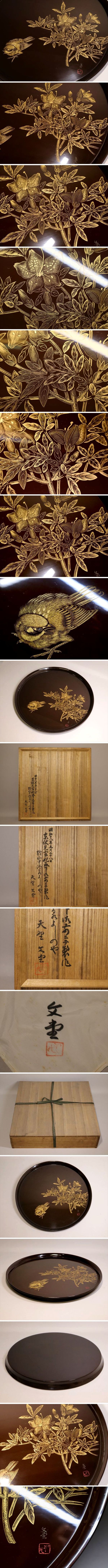 本物保証。状態良好です。女性初の輪島漆芸作家として名を残す天野文堂による見事な仕上がりの作品です。昭和18年に山中温泉よしのやに於いて、東伏見宮妃殿下の御前にて制作された特別な逸品です。花鳥の沈金は細かい所まで非常に丁寧に施されており、洗練された最高の出来栄えになっています。天野文堂らしい優れた画技と雅趣あふれる最高峰の作品です。