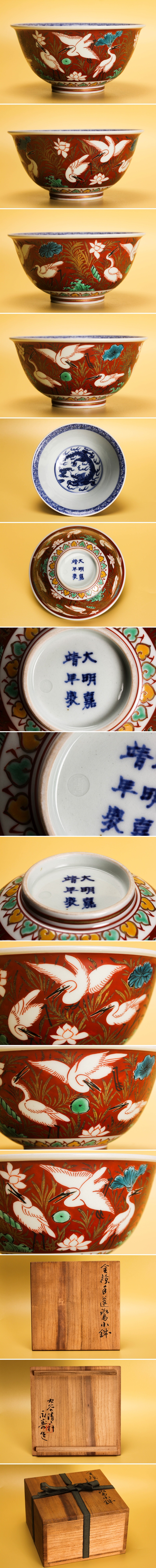 希少秀逸作! 初代 矢口永寿 九谷清々軒 金襴手蓮鷺小鉢 幅14.5cm 共箱 本物保証 收藏