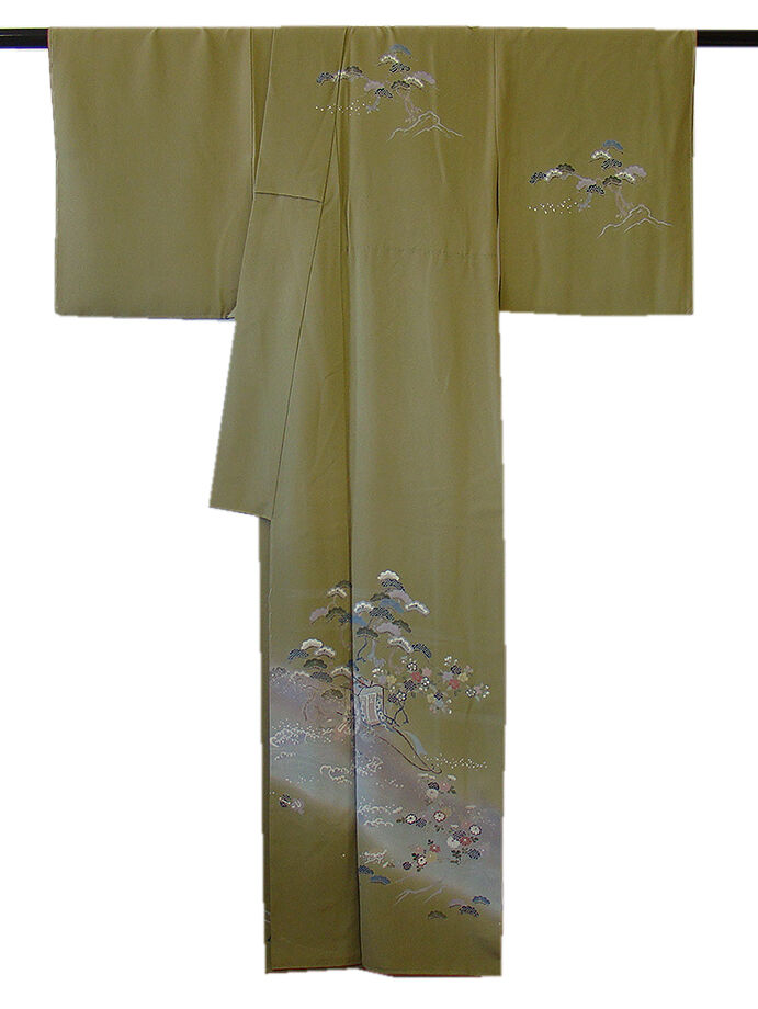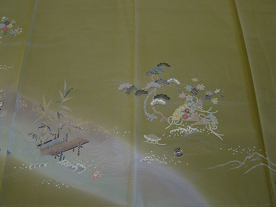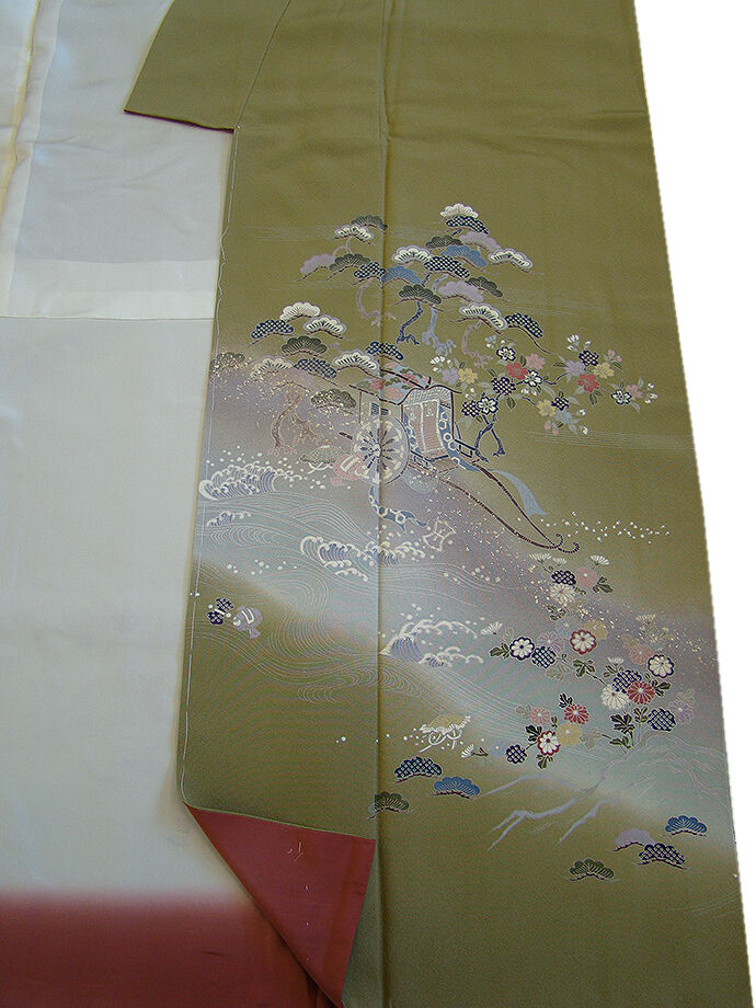 | 商品説明 | こちらのお品は「袷」ですので10月から5月までお召頂ければと思います。 とてもしなやかで柔らかな手触りの着心地良い重めの上質な極上ちりめん地の生地、 渋い黄海松茶色地に裾にかけて灰、灰青色ぼかしに四季の花木、宝尽し、波、 扇面、御所車等の本加工染に金彩加工仕立て、 気品に満ち溢れた彩りが正統派のお着物として一枚は欲しい逸品の素敵なお着物です。 八掛は蘇芳香色(正絹)、幅広い年代の方にお召頂けます。 |