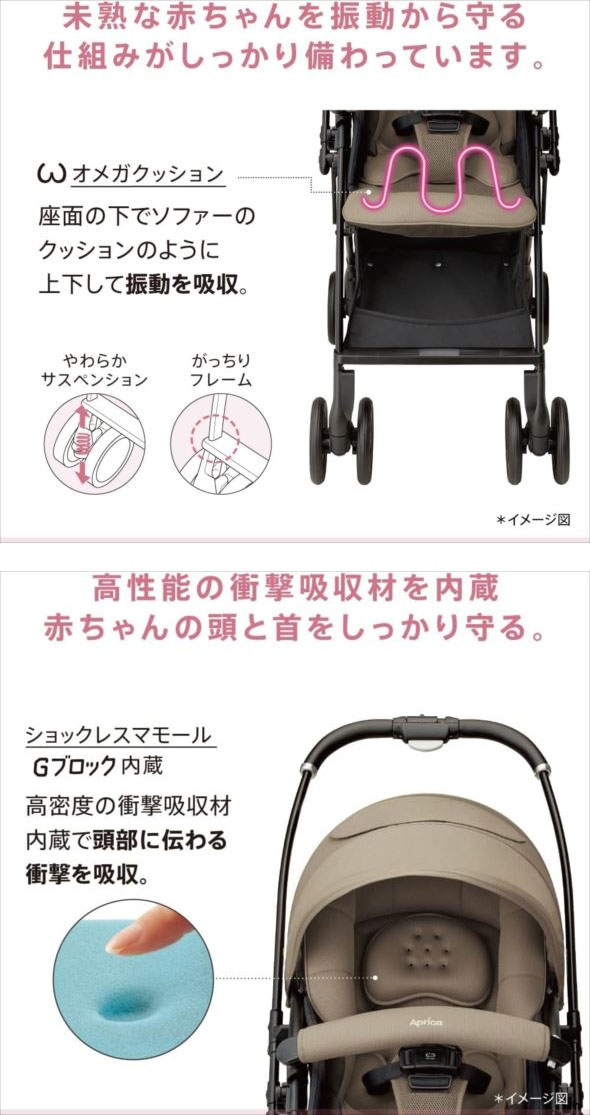 【商品特長】 ●アップリカ 「ラクーナクッション AH」 生後1カ月から使える軽量5.6kgの両対面オート4輪ベビーカー。 ●未熟な赤ちゃんを振動から守る仕組み 振動を吸収する座面下の「オメガクッション」と、「がっちりフレーム」と「やわらかサスペンション」からなる 振動吸収設計でガタガタ道の振動から赤ちゃんのからだを守る。 ●赤ちゃんの頭と首をしっかり守る 衝撃吸収材Gブロックを内蔵したヘッドパッド「ショックレスマモール」が、赤ちゃんの頭と首をしっかりと守る。 ●進化したダブルタイヤ 接地点が多く安定性が強みのダブルタイヤ。15cmの大径タイヤと20個のベアリング内蔵で、 押しやすさや段差の乗り越えやすさが向上。 ●簡単リクライニング 赤ちゃんの様子を見ながら、片手で簡単にリクライニングできる「フィットリクライニング」。 | |||||||||||||||||||||