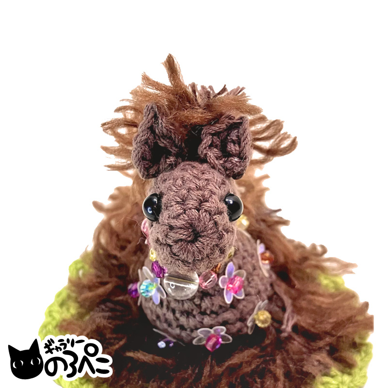 末広がりのお馬さんの置物(ヒマラヤ水晶の首飾りをつけたおウマさんのあみぐるみ・葉っぱ色のマット付き) n1000-161 收藏