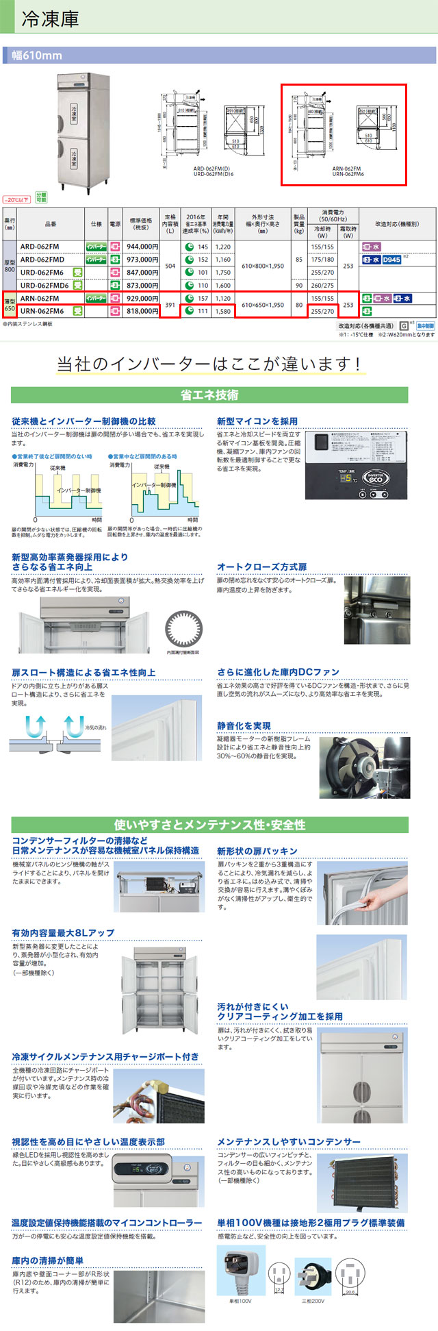 フクシマ 2ドア冷凍庫 ARN-062FM を出品いたします。 ■特徴■ 環境にも厨房にもやさしい冷蔵庫 ランニングコスト、CO2の大幅削減、 環境にも厨房にもやさしい冷蔵庫。 省エネ性をさらに追求しました。 従来機とインバーター制御機の比較 インバーター制御機は扉の開閉が多い場合でも、 省エネを実現します。 新型高効率蒸発器採用により さらなる省エネ向上 高効率内面溝付管採用により、冷却面表面積が拡大。 熱交換効率を上げてさらなる省エネルギー化を実現。 扉スロート構造による省エネ性向上 ドアの内側に立ち上がりがある扉スロート構造により、 さらに省エネを実現。 新型マイコンを採用 省エネと冷却スピードを両立する新マイコン基板を開発。 圧縮機、凝縮ファン、庫内ファンの回転数を 最適制御することで更なる省エネを実現。 オートクローズ方式扉 扉の閉め忘れをなくす安心のオートクローズ扉。 庫内温度の上昇を防ぎます。 さらに進化した庫内DCファン 省エネ効果の高さで好評を得ている DCファンを構造・形状まで、 さらに見直し空気の流れがスムーズになり、 より高効率な省エネを実現。 静音化を実現 凝縮器モーターの新樹脂フレーム設計により 省エネと静音性向上 約30%~60%の静音化を実現。 コンデンサーフィルターの清掃など 日常メンテナンスが容易な機械室パネル保持構造 機械室パネルのヒンジ機構の軸が スライドすることにより、 パネルを開けたままにできます。 有効内容量最大8Lアップ 新型蒸発器に変更したことにより、 蒸発器が小型化され、有効内容量が増加。 冷凍サイクルメンテナンス用チャージポート付き 全機種の冷凍回路にチャージポートが付いています。 メンテナンス時の冷媒回収や冷媒充填などの 作業を確実に行います。 視認性を高め目にやさしい温度表示部 緑色LEDを採用し視認性を高めました。 目にやさしく高級感もあります。 温度設定値保持機能搭載のマイコンコントローラー 万が一の停電にも安心な温度設定値保持機能を搭載。 庫内の清掃が簡単 庫内底や壁面コーナー部がR形状(R12)のため、 庫内の清掃が簡単に行えます。 新形状の扉パッキン 扉パッキンを2重から3重構造にすることにより、 冷気漏れを減らし、より省エネに。 はめ込み式で、清掃や交換が容易に行えます。 溝やくぼみがなく清掃性がアップし、衛生的です。 汚れが付きにくい クリアコーティング加工を採用 扉は、汚れが付きにくく、 拭き取り易いクリアコーティング加工をしています。 メンテナンスしやすいコンデンサー コンデンサーの広いフィンピッチと、 フィルターの目も細かく、 メンテナンス性の高いものになっております。 ■仕様■