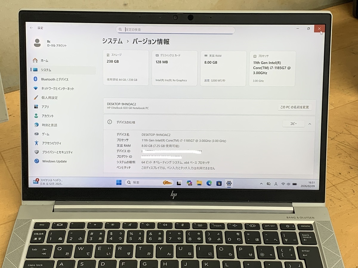 ノートパソコン中古 i7第11世代 i7-1185G7 HP EliteBook 830 G8 Notebook PC i7 11th gen laptop メモリ8GB NVMe 256GB ノートPC