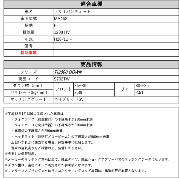 [RS-R_Ti2000 DOWN]MA46S ソリオバンディット_ハイブリッドSV(2WD_1200 HV_H28/11~)用車検対応ダウンサス[S702TW] 收藏