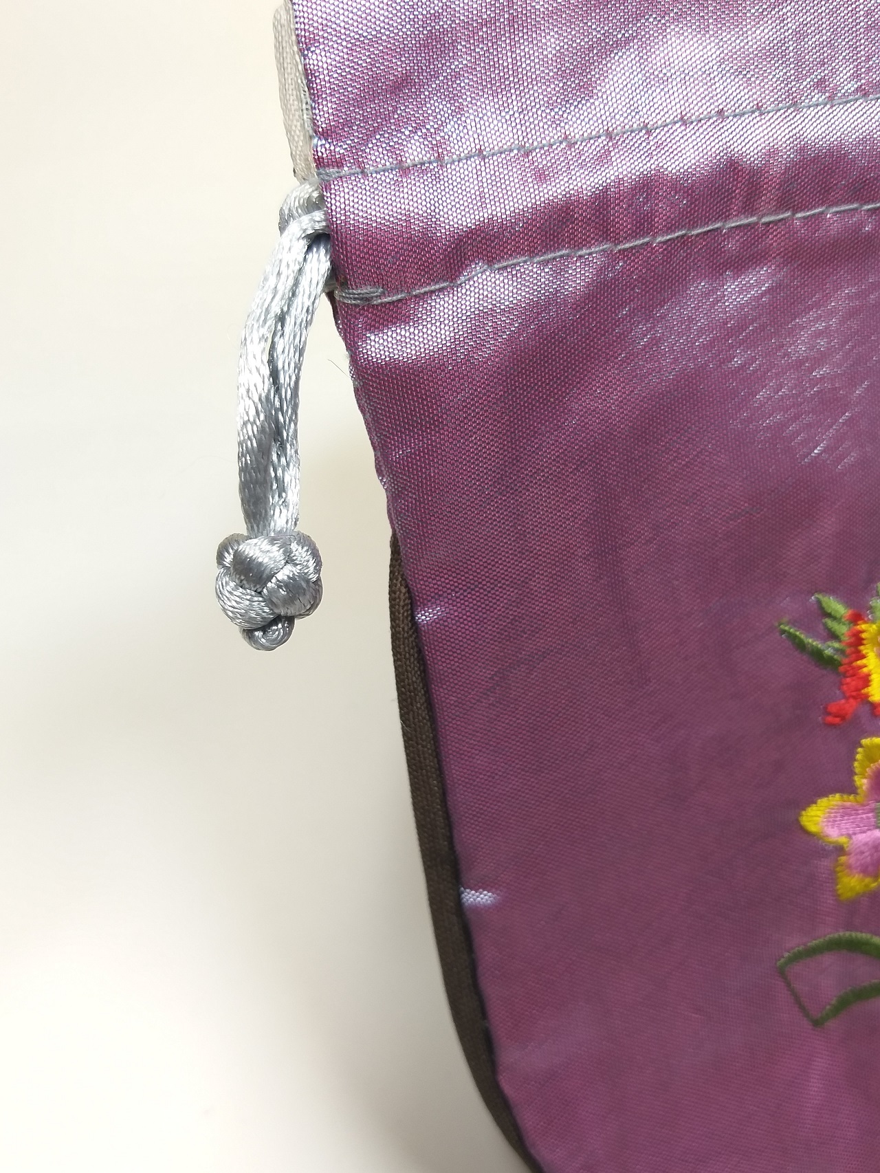 この種の巾着の外側生地は、シルク製で、たいへん綺麗な両面立体刺繍刺繍が施されております。内布は、ナイロン生地製で、製作は、全てが手工芸によるものです。