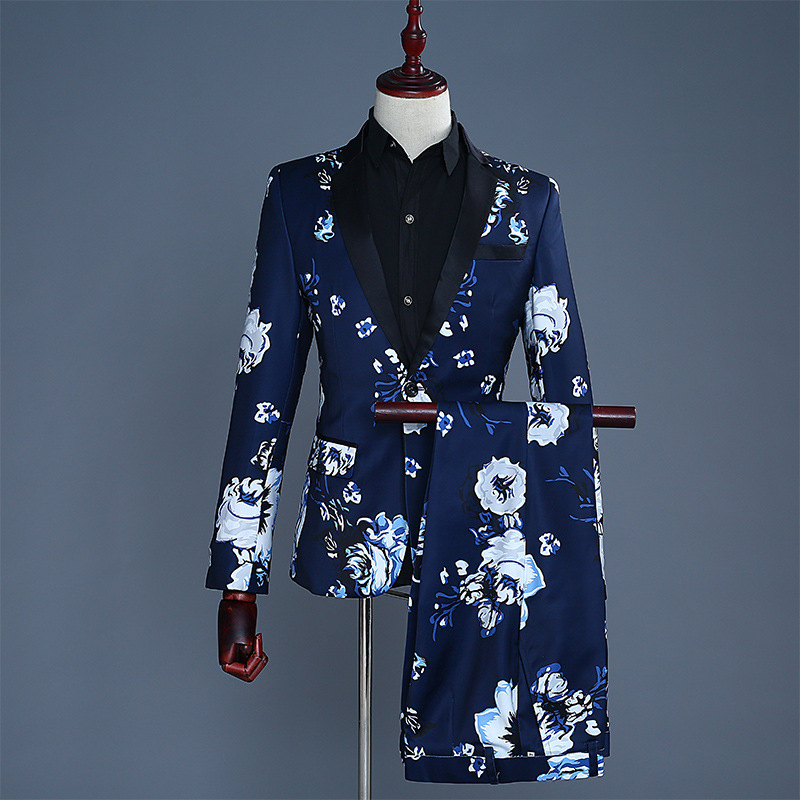 新作新品 上質 2点セット 花柄 紺色ネイビー タキシード コスプレ シングル ステージ衣装メンズ スーツセット上着ズボンS M L-2XL司会 收藏