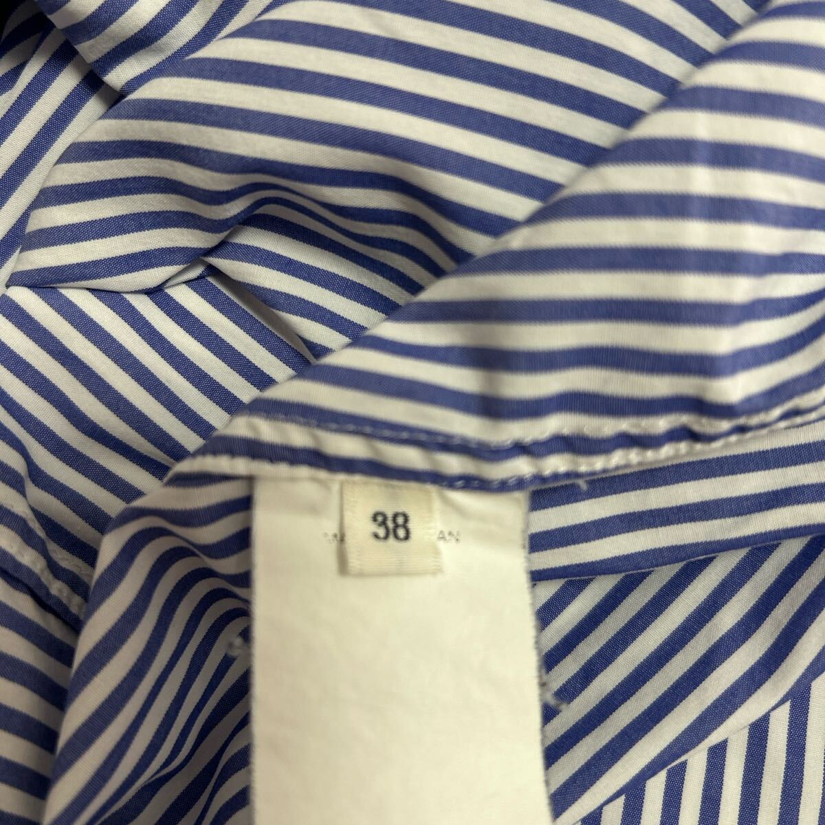青と白のストライプデザインの五分袖チュニック、ボタン付きで後ろにギャザーが特徴。 - ブランド: Adam et Rop - 色: ストライプ(青と白) - スタイル: チュニック - 袖の長さ: 五分袖 - デザイン: ボタン付きの前開き - 後ろデザイン: ギャザー入り 着丈90、身幅81cm、肩幅62cm、袖丈45cm ストレッチなしのシャンブレー(シャツ生地)です。 汚れ痛みなし。洗濯表示タグにサンプルと記載がありますが、店頭商品と変わりありません。 袖は7分程度で短めです。ワンピースとしてもチュニックとしても活躍するデザインです。 ご覧いただきありがとうございます。