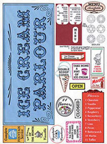 米国製のショップサインです。カレンダー用紙より少し薄いくらいの紙に印刷されています。切り抜いてお使いください。これをプラスするだけで、ドールハウスのお店屋さんがグレードアップしそうですよ!表面に光沢はなく、少し古めかしい感じになっています。ICE CREAM PARLOURサインのサイズ:63x150ミリ(ブルーの枠)用紙全体のサイズ:140x215ミリ。