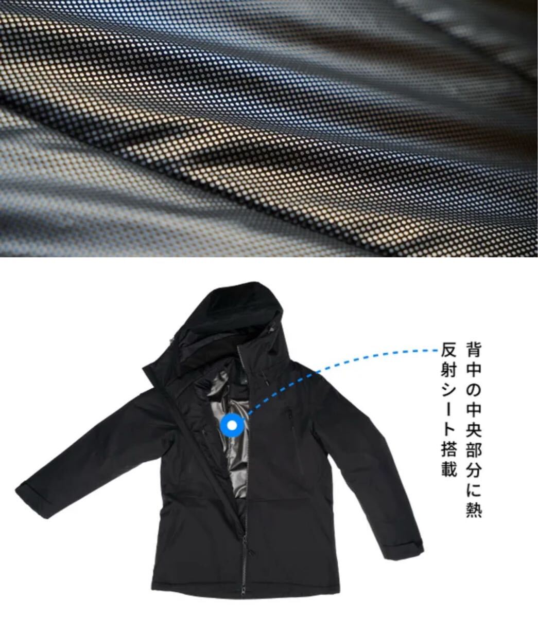 ボレアスジャケットの裏地にナノ銀で加工し、人体が放出する熱(赤外線)を反射して外に逃がさないため、保温性を高めます。