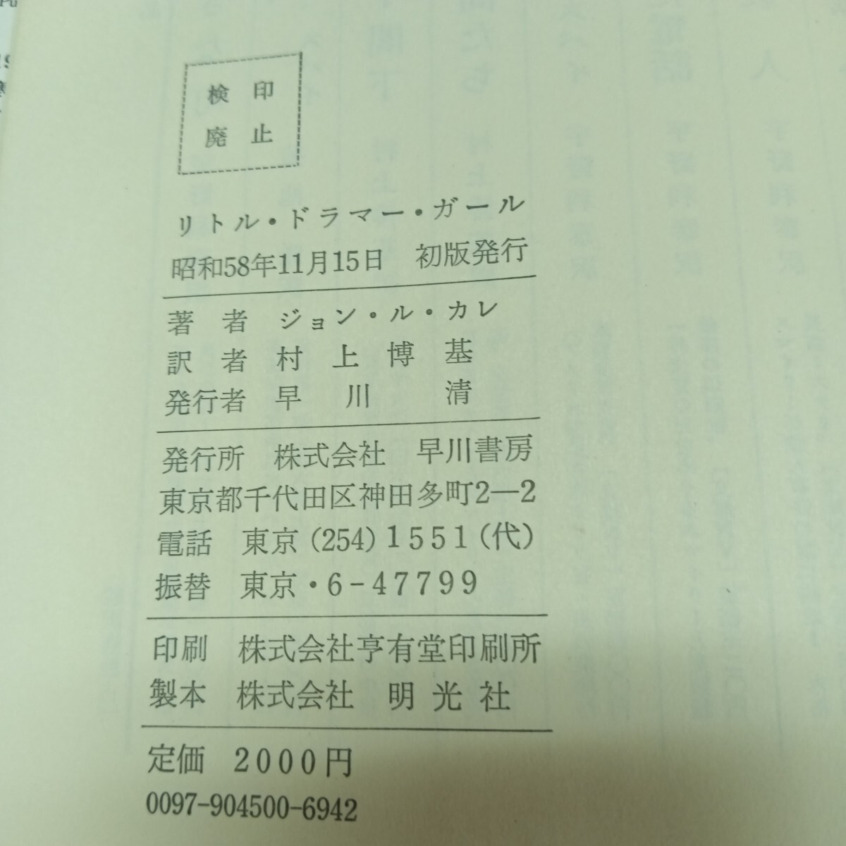 Ke-036/ジョン・ル・カレ リトル・ドラマー・ガール 村上博基一 訳 昭和58年11月 発行/L6/70903