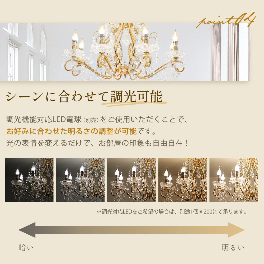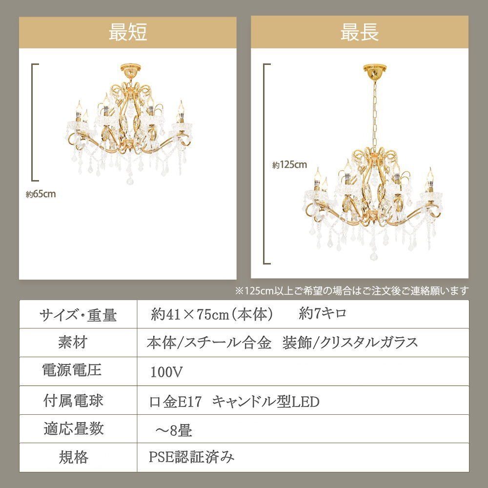 | 商品説明 | ![]() ☆LED電球サービスキャンペーン開催中!☆【送料無料!】★超激安即決!★新品 キャンドル8灯クリスタルシャンデリア♪ ●キャンペーン期間中 広角LED電球8灯(¥9600-相当)お付けいたしまして驚きのプライス! ☆LED電球サービスキャンペーン開催中!☆ ※通常電球別売の為、価格記載の電球画像掲載がございますがキャンペーン期間中は無償提供(調光別途¥200-)させて頂いております※ ☆上質水晶ならではの最高の輝きを放つ新品クリスタルシャンデリア ☆添付画像では肉眼で見る本来のクリスタルの輝きをご確認いただけませんが、8灯の電球が上質クリスタル水晶を通し光の屈折で光の持つ本来のカラーをかもし出しダイヤモンドのように輝きながらワット数以上の明るさでお部屋を照らします ☆スタイルは飽きの来ないシンプルなデザインです♪ ☆とても明るくおしゃれなシャンデリアです ☆シャンデリア本体は調光にも対応しており、お好みの明るさに調整可能です ※調光が必要の場合、調光対応LED1個別途¥200-と汎用調光器が必要です ☆付属電球・・・口金E17広角LED暖色6灯(明るさ40ワット消費電力4ワット 暖色36Lm/W・白色40Lm/W) ※調光対応LED1個別途¥200- ※白色LEDご希望の場合はご注文後お申し付けください 商品画像は暖色LEDを装着し撮影しております ☆取り付けに関しましてはワンタッチでは御座いませんが(配線はワンタッチ)引掛けシーリングに対応しております ☆リビング等に最適なゴージャスクリスタルシャンデリアを是非この機会に! ☆サイズ・高さ(天井よりシャンデリア本体底辺)約55~125cm調整可能 直径約75cm 重量約7キロです ※125センチ以上必要の場合はご注文後お申し付けください ![]() |