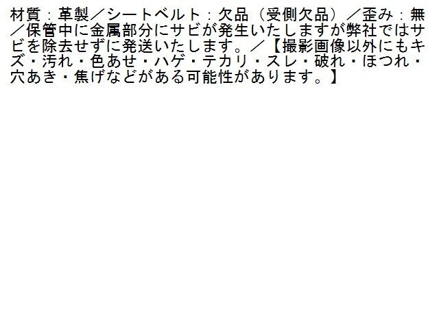 | 商品情報 | 材質:革製/シートベルト:欠品(受側欠品)/歪み:無/保管中に金属部分にサビが発生いたしますが弊社ではサビを除去せずに発送いたします。/【撮影画像以外にもキズ・汚れ・色あせ・ハゲ・テカリ・スレ・破れ・ほつれ・穴あき・焦げなどがある可能性があります。】 | ||