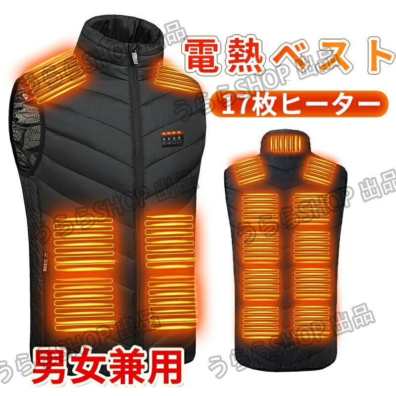 電熱ベスト一枚で冬の防寒対策が万全!前面に6箇所、背面に11箇所、合計17箇所の炭素繊維ヒーターが内蔵されている。スイッチを入れるとぽかぽか、3秒即暖の伝導熱率の高さに自慢する。ヒーターがしめる面積が広く、背中や腹から肩と首元まで包みこむ暖かさ。