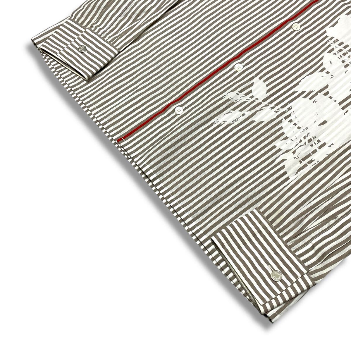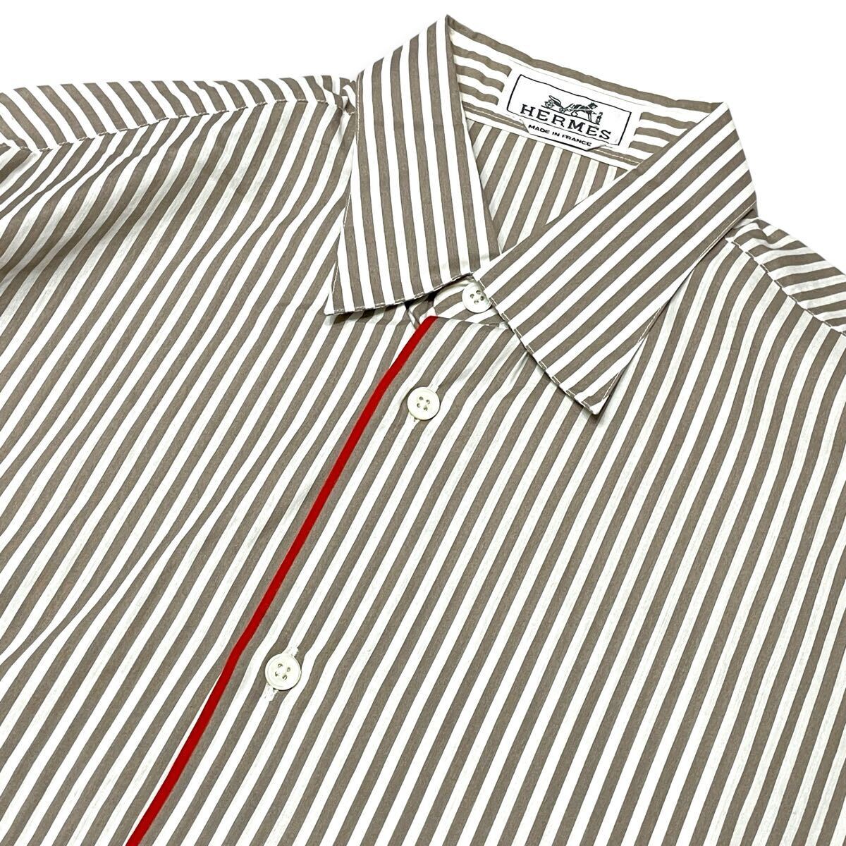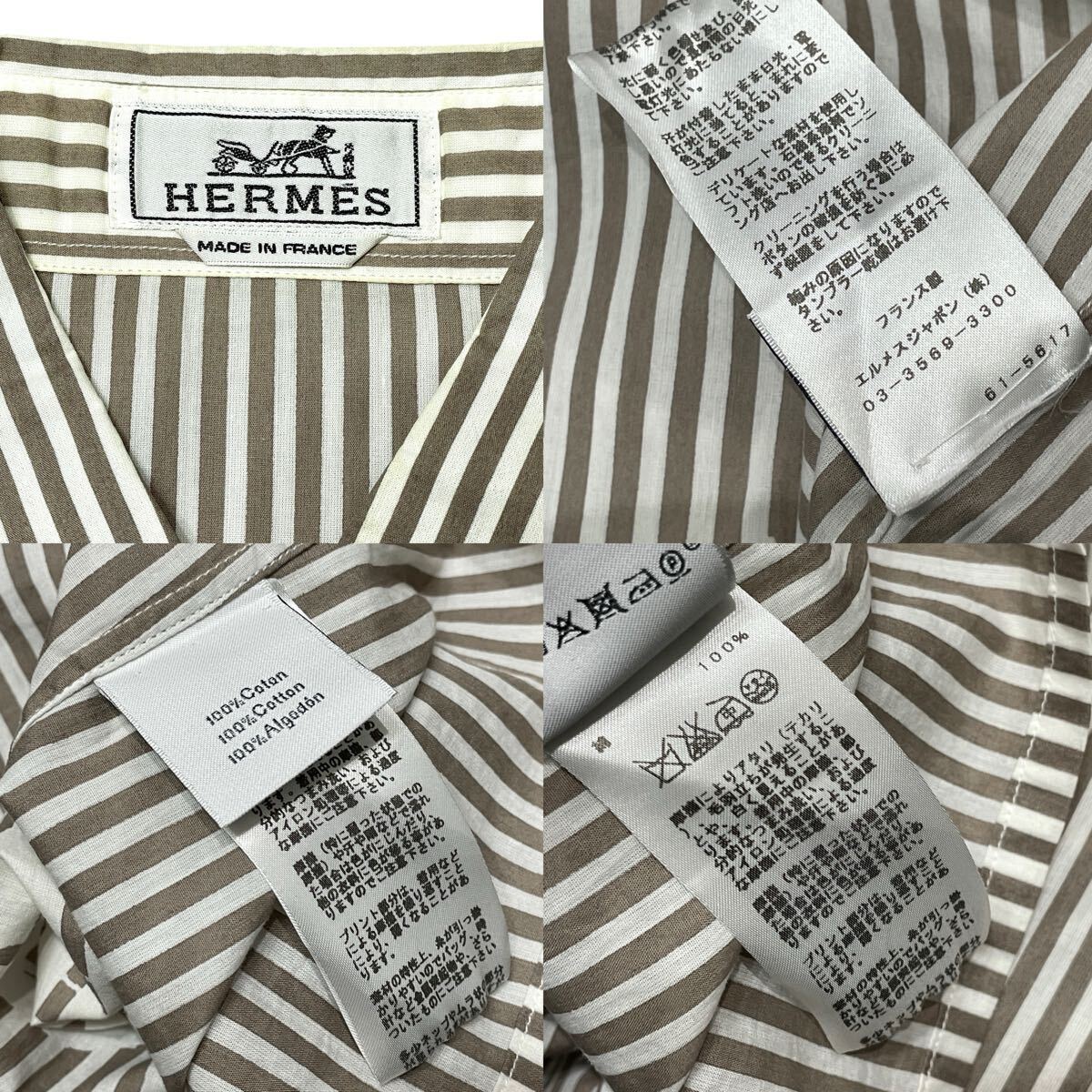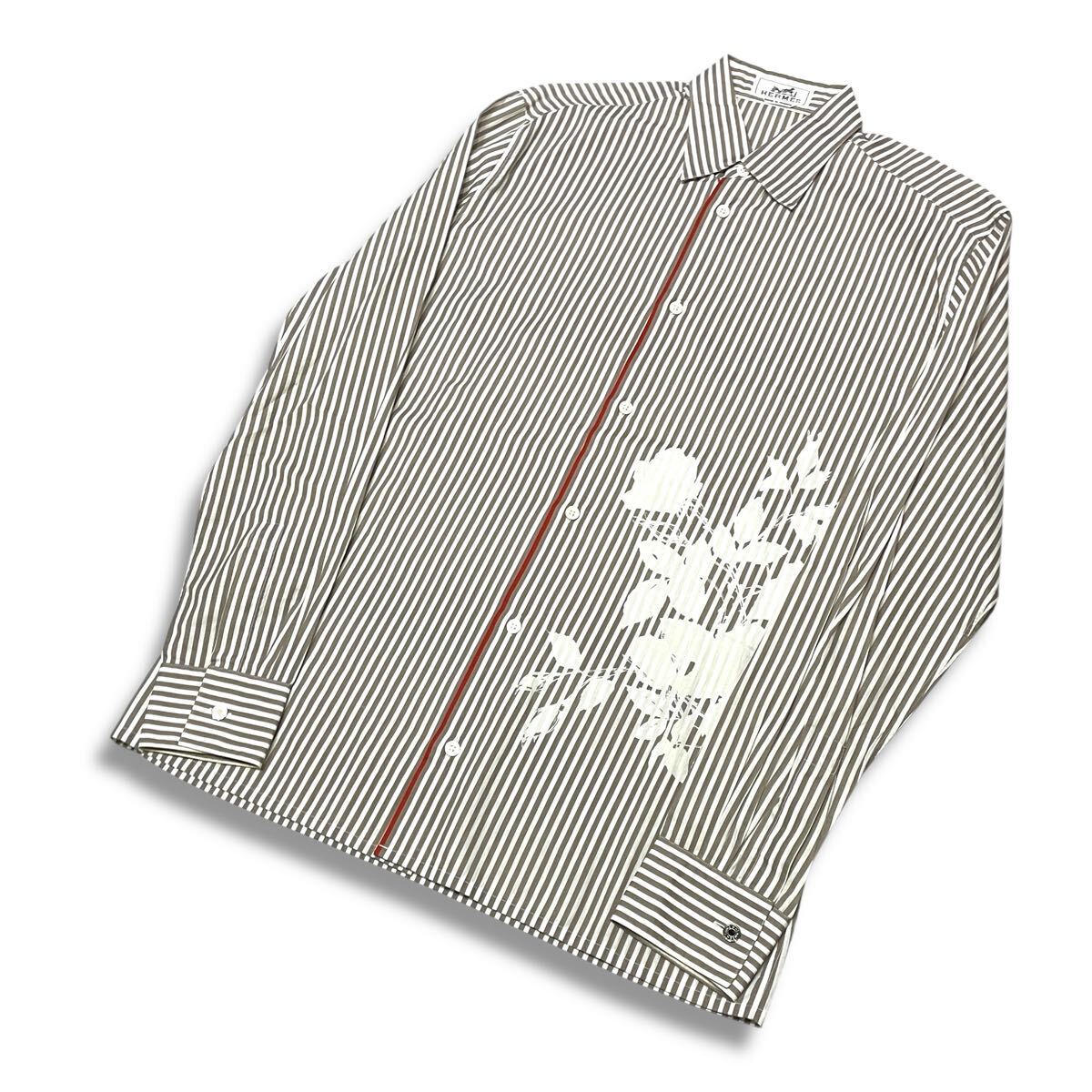 9 国内正規品 HERMES エルメス ストライプ 長袖コットン フラワー ロゴ ドレスシャツ 39 グレー系 セリエ ロゴボタン メンズ フランス製 收藏