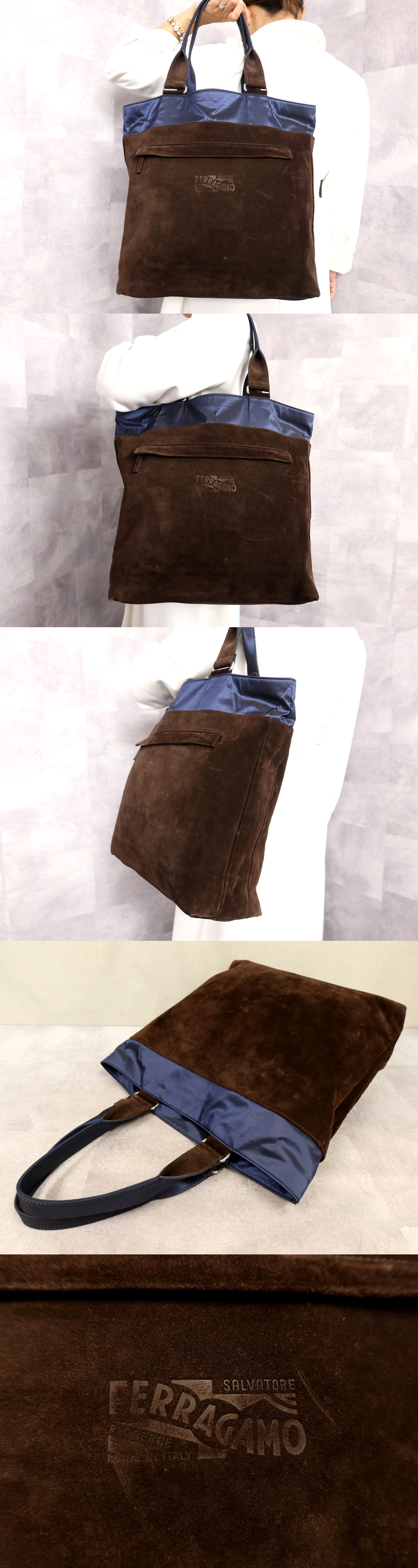 ●超美品●フェラガモ●メンズ●ナイロン スエード レザー 本革●トート バッグ●ネイビー ブラウン●SV金具●肩掛け●A4 かばん●Js62346 收藏