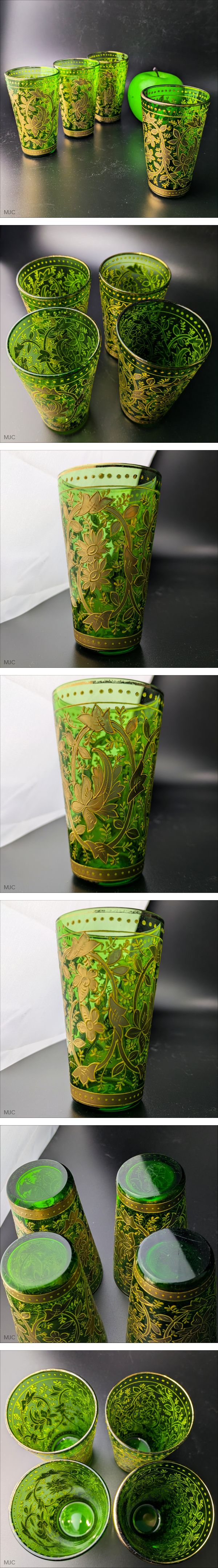 Moser モーゼル 金彩グラス 4個セット エメラルドグリーン アラベスク文様 唐草 銀色 盛上げ エナメル彩 美品 ボヘミアグラス アンティーク 收藏