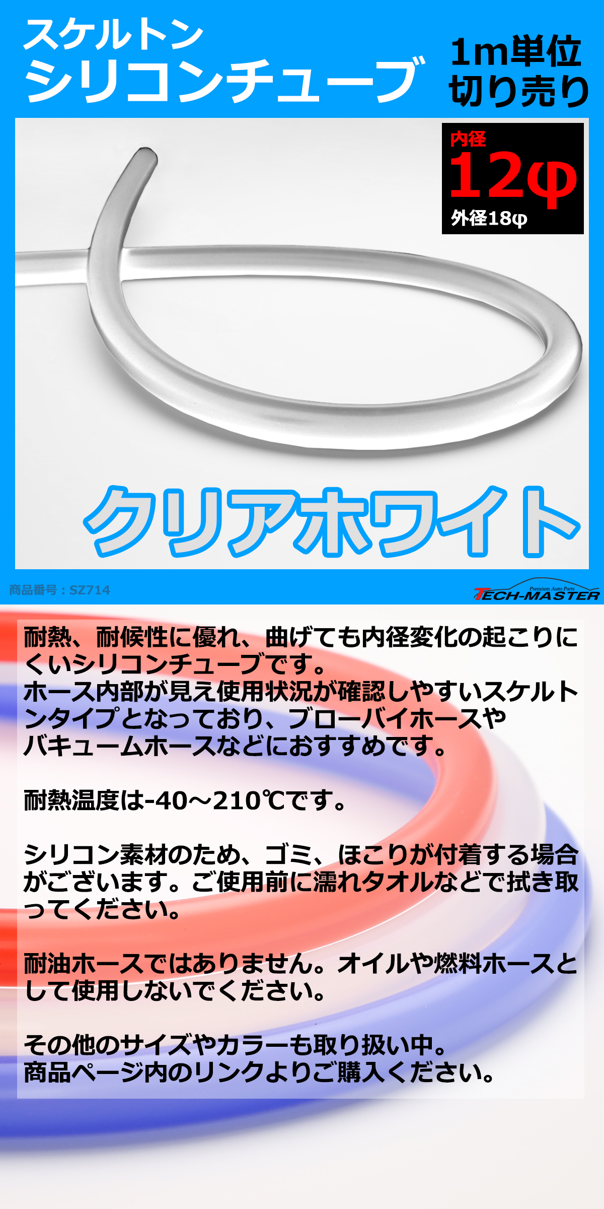 12φ スケルトン シリコンチューブ クリアホワイト 内径12mm 外径18mm 半透明 シリコンホース SZ714 收藏
