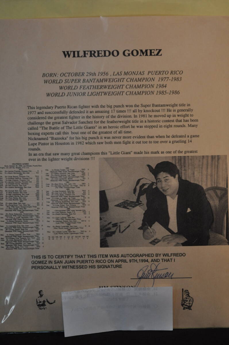 直筆 世界チャンピオン ウィルフレド・ゴメス サイン サイン時の写真&日付&戦績付 入手者署名入り真筆証明付 約250x200ミリ 收藏