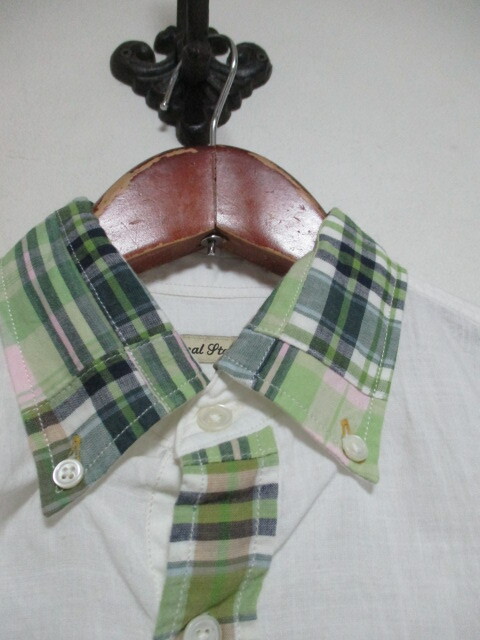 | 商品紹介 | 少しクリームっぽい白に緑系チェックが使われた オシャレな長袖シャツです。 胸の上に刺繍が入っています。 折り返しても着れるようになっていて、 落ちないようにボタンと紐が付いています。 紐は襟と同じ緑系チェック生地が使われています。 《素材》 本体:綿100% 別地:麻100% (42025) |