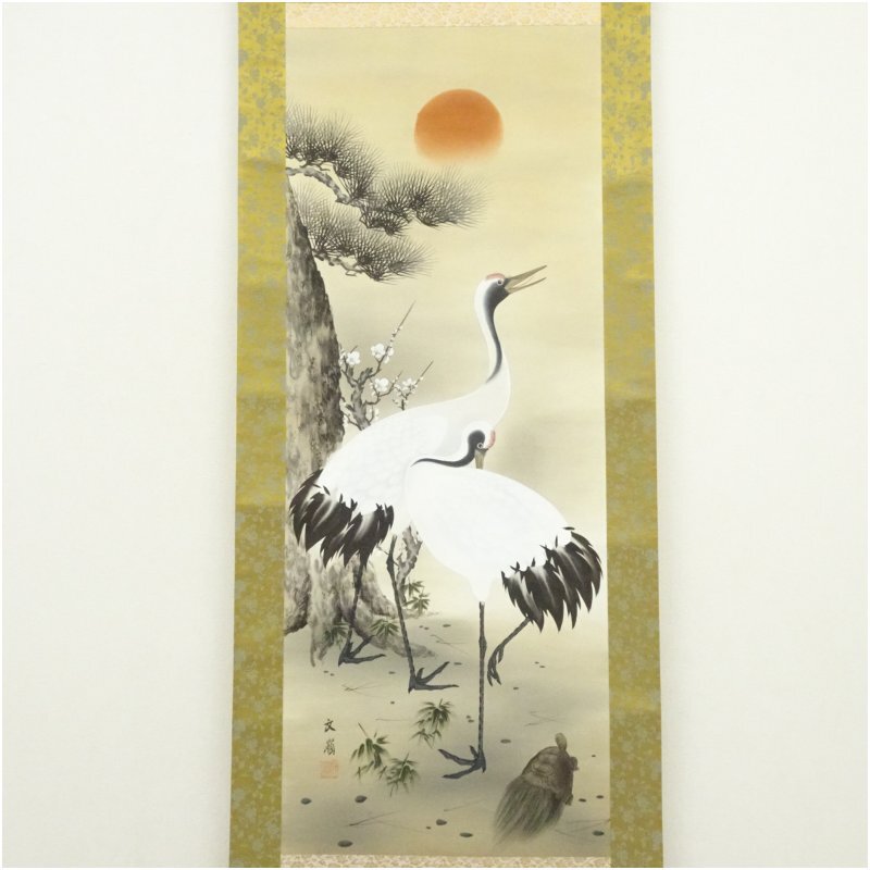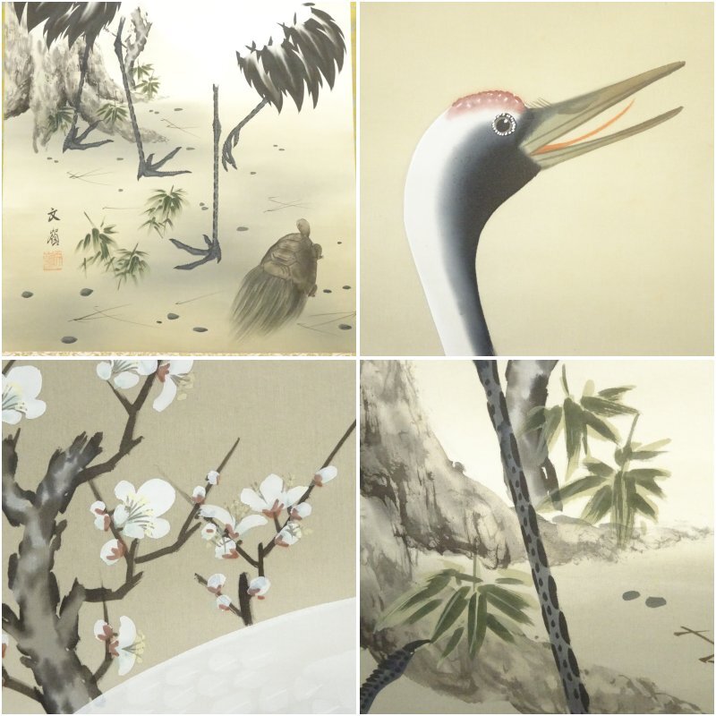 文嶺筆 松竹梅鶴亀 肉筆絹本掛軸 收藏