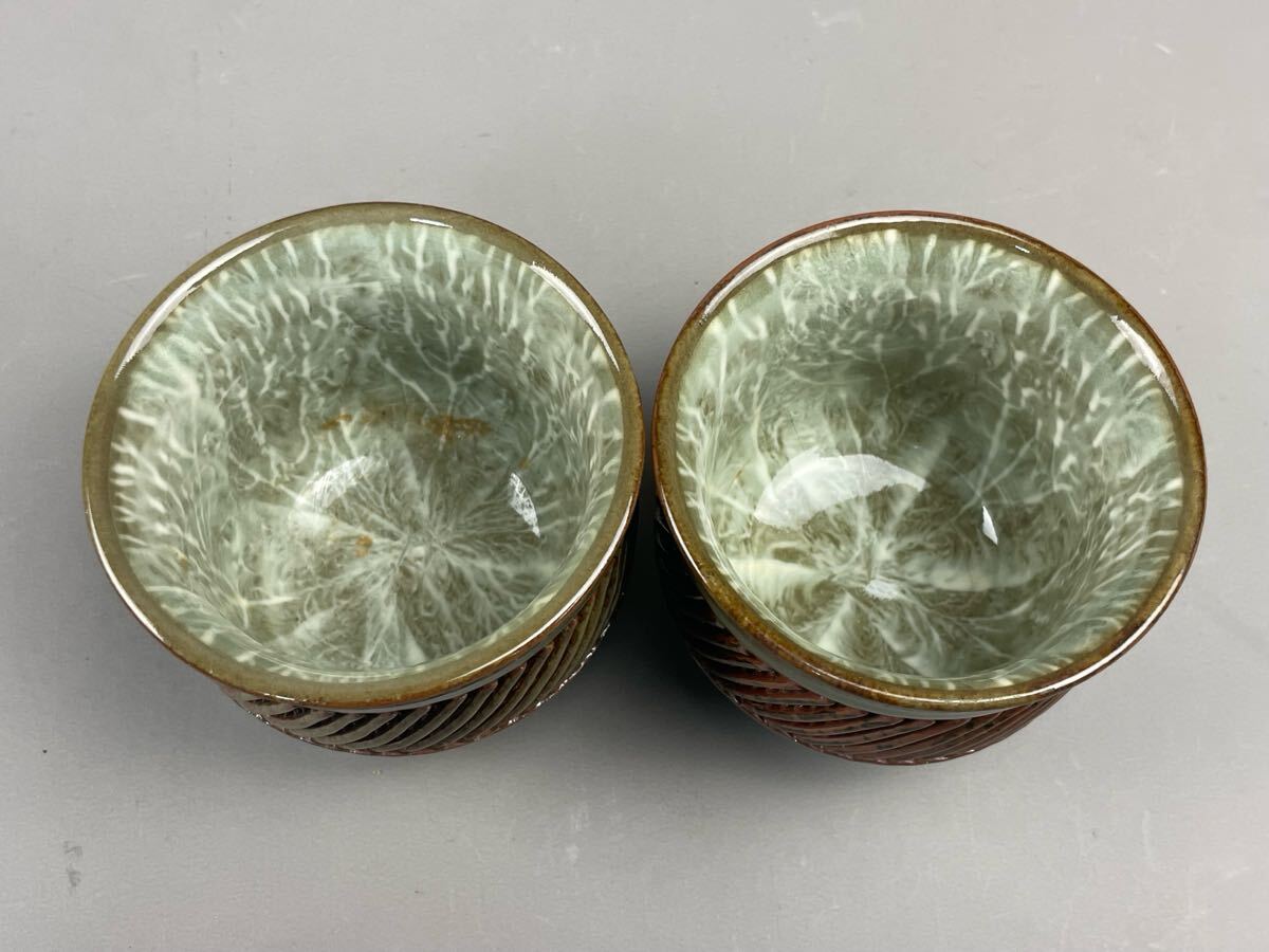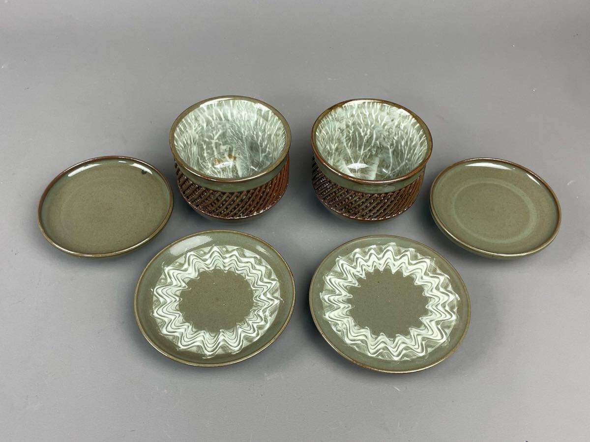 平戸 三川内焼 嘉平作 夫婦茶碗 透かし 網目細工 2点セット 蓋物 蓋付湯呑み 和食器 陶磁器 茶器 茶道具 有田 伊万里 收藏