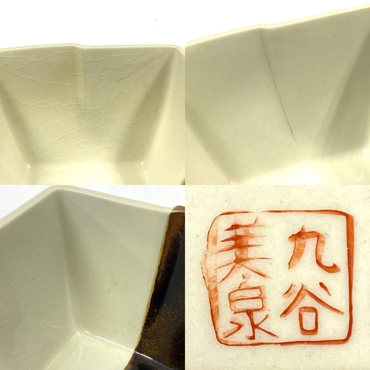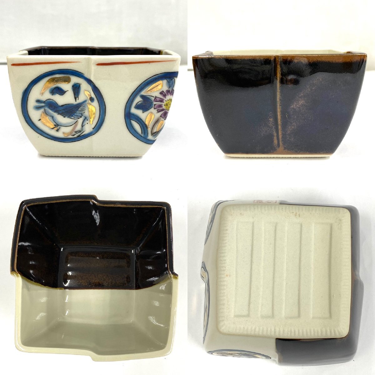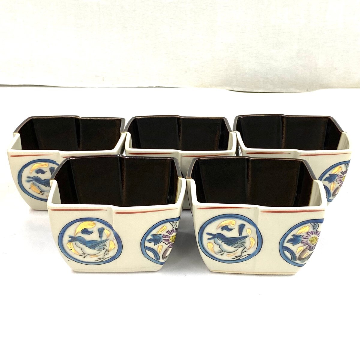 ◆九谷焼◆小鉢揃 5客セット 角小鉢 小皿 お椀 食器 アイボリー ブラウン 色絵 花鳥図 雀 花 陶磁器 共箱/栞付 伝統工芸品 アンティーク 收藏