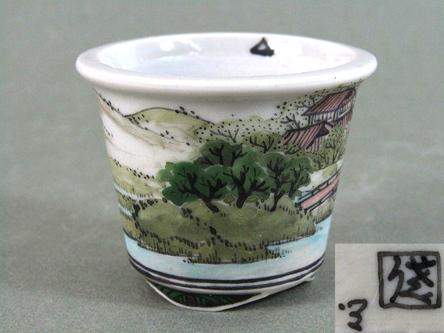 C731 作家もの 色絵 山水図 丸鉢 間口約4.2cm 小品盆栽【説明欄に詳細写真有り】
