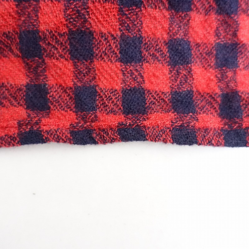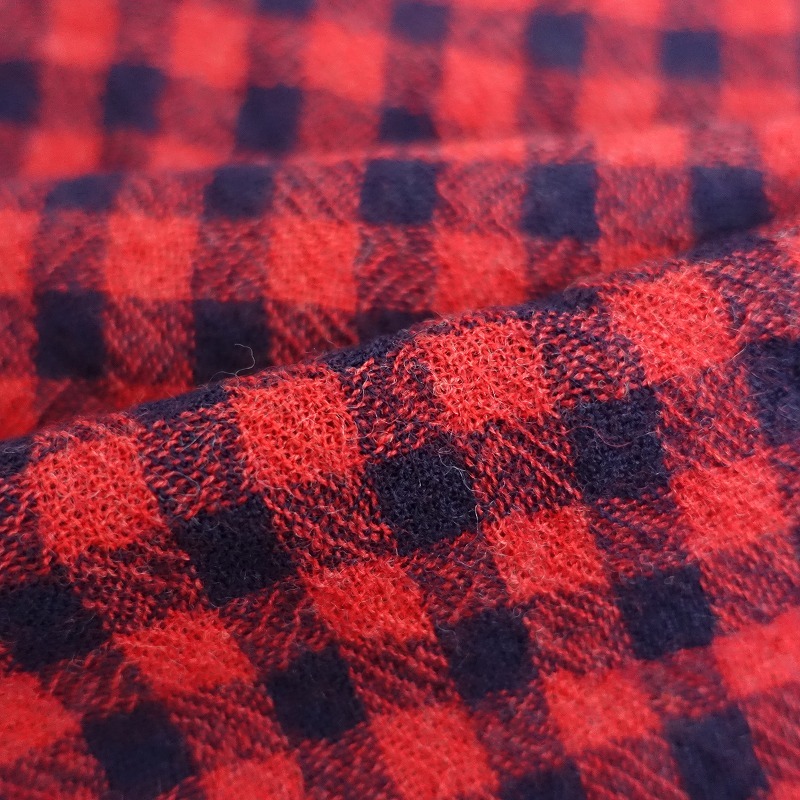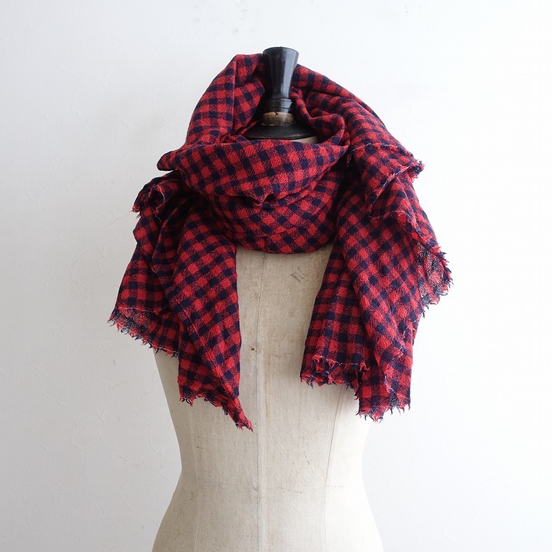 | ICHIのギンガムチェックストールです。カラーはレッド×ダークネイビーのギンガムチェックで、両サイドは控え目なフリンジ仕様です。 |