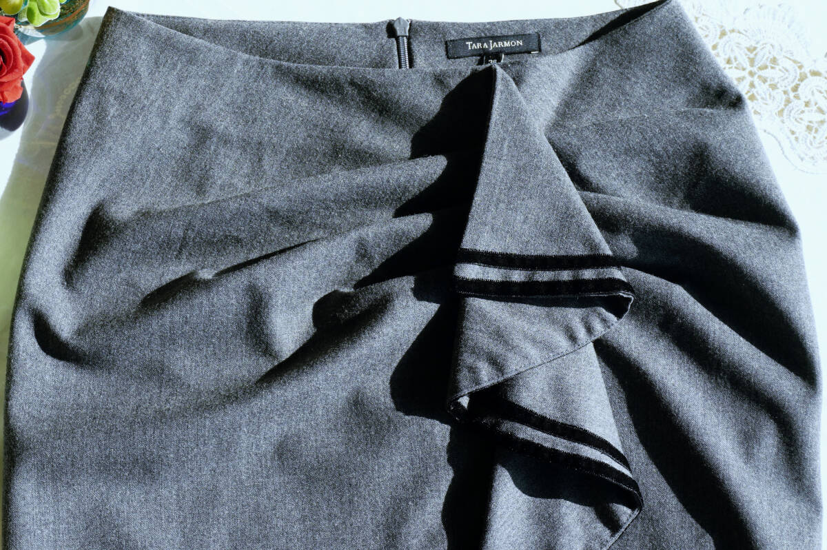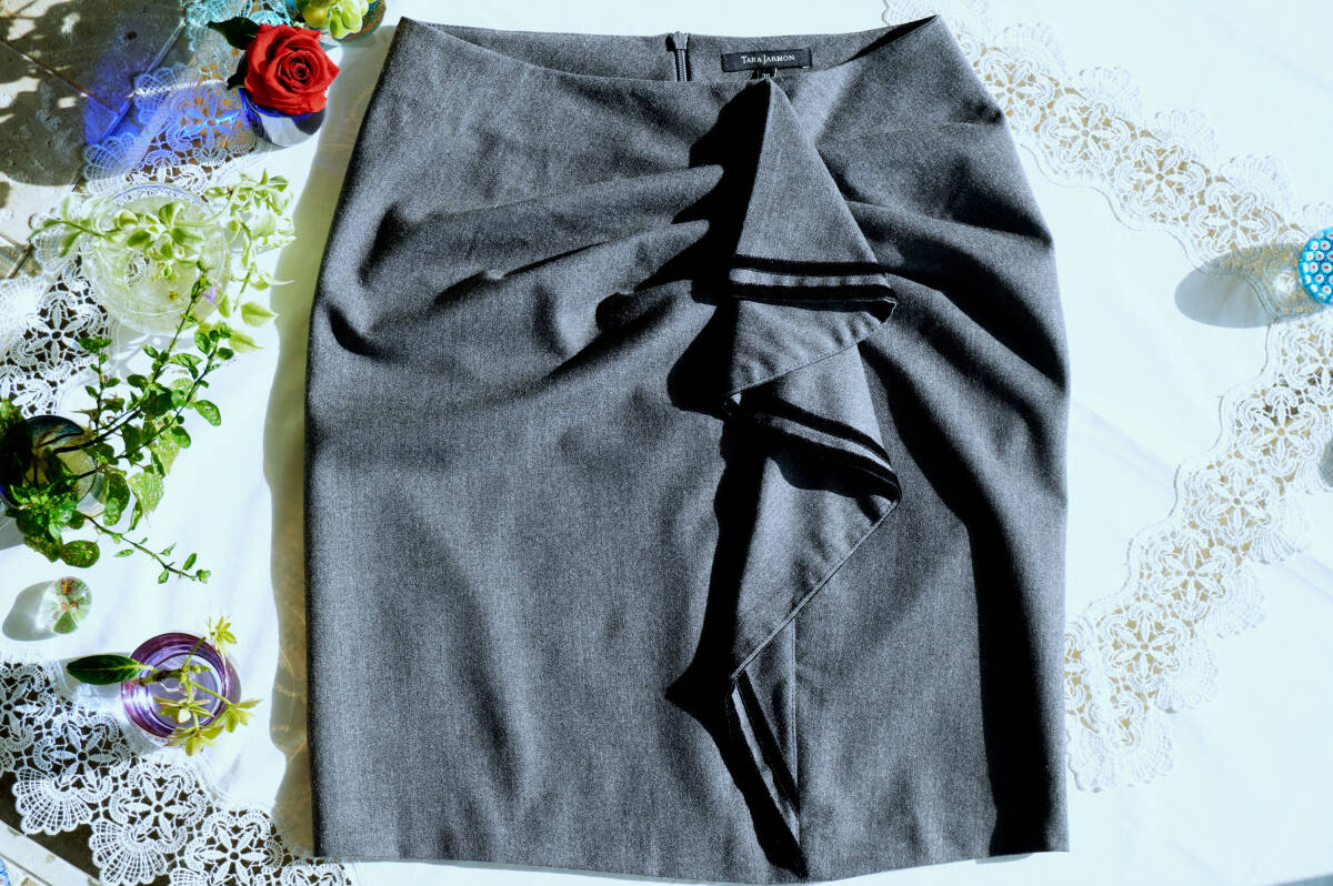 黒いベルベットリボンがラッフルフレアーフリルに際立つ、シャーリングタック使いのタイトスカート(お膝上丈)です*(#^.^#)