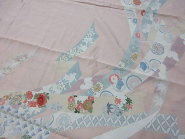 1円 中古 訪問着 正絹 着物 縮緬 式典 和装 和服 熨斗 草花 青海波 七宝繋ぎ 高級 袷 身丈153cm 裄68cm【夢職】★ 收藏