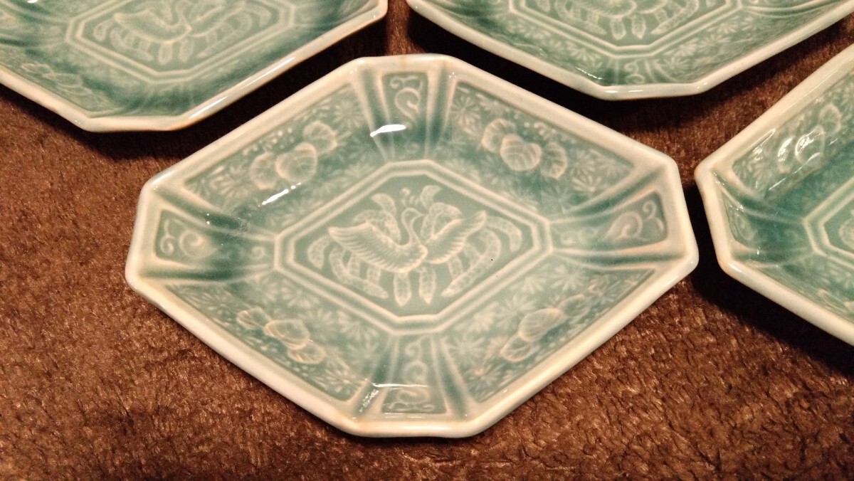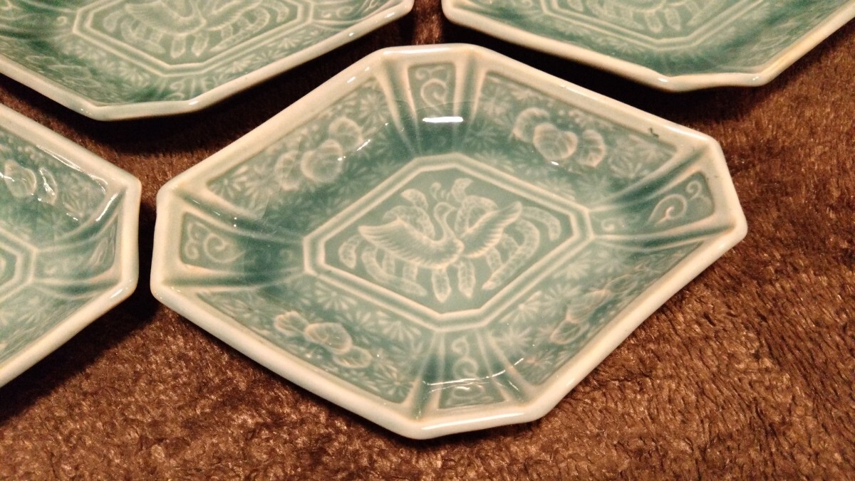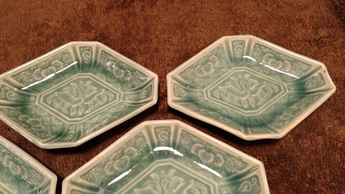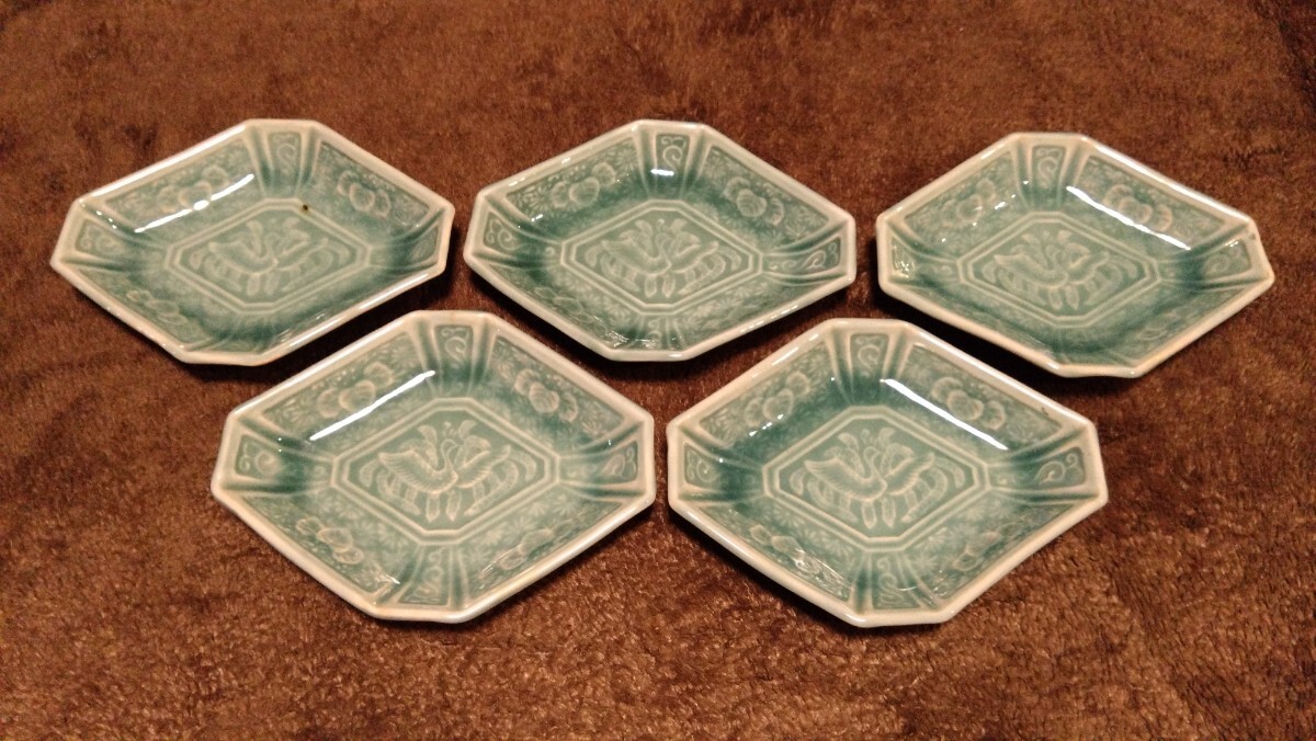李朝 青磁 鳳凰 陽刻 菱形皿 菓子皿 蔵出し 5客