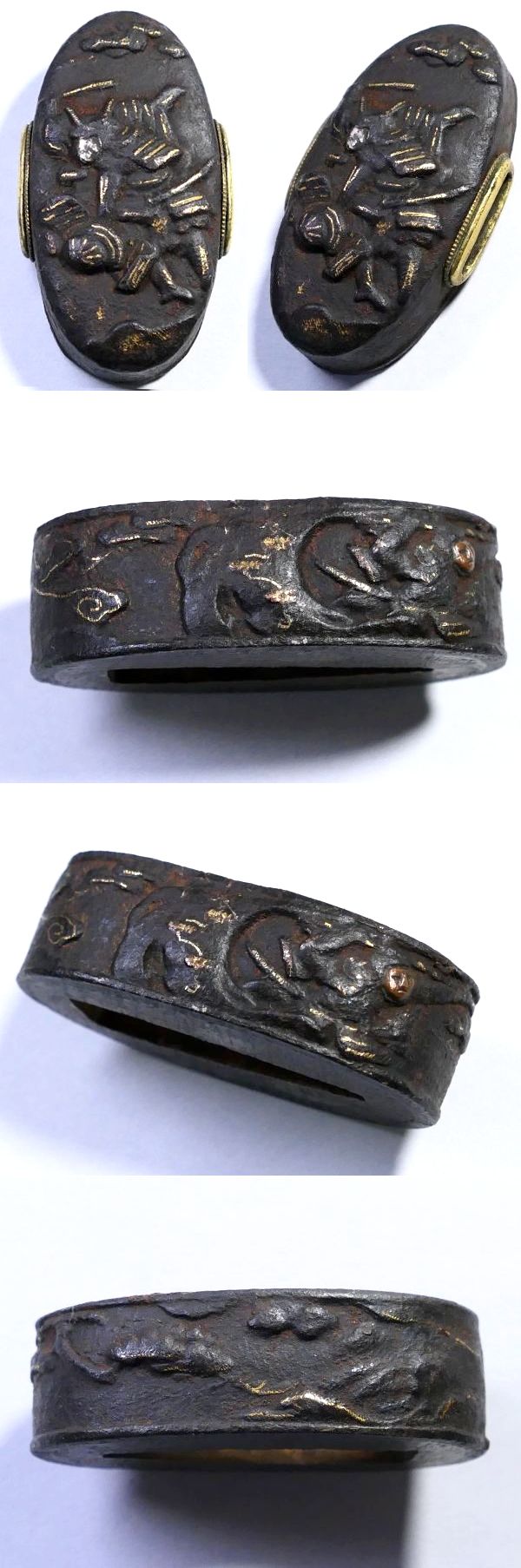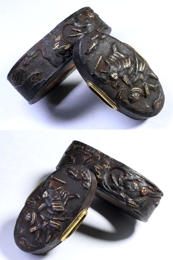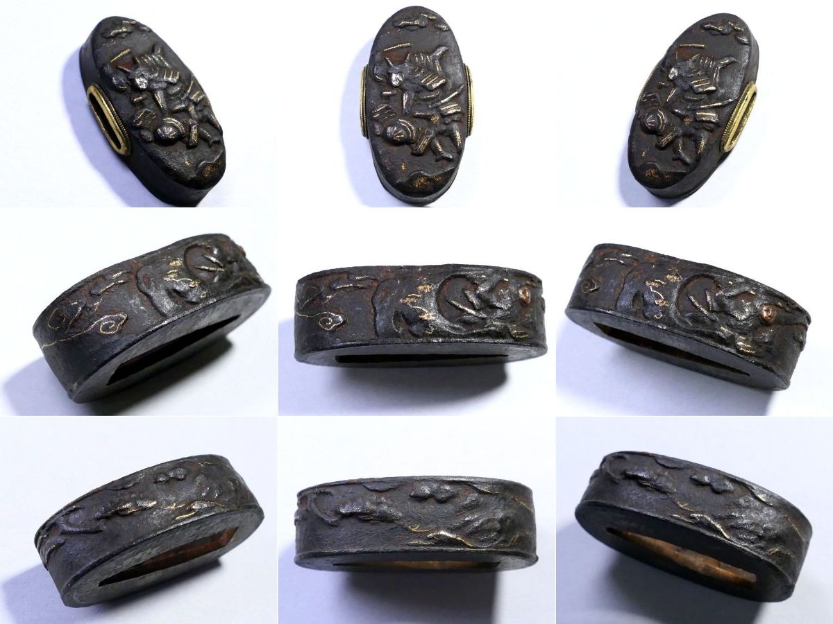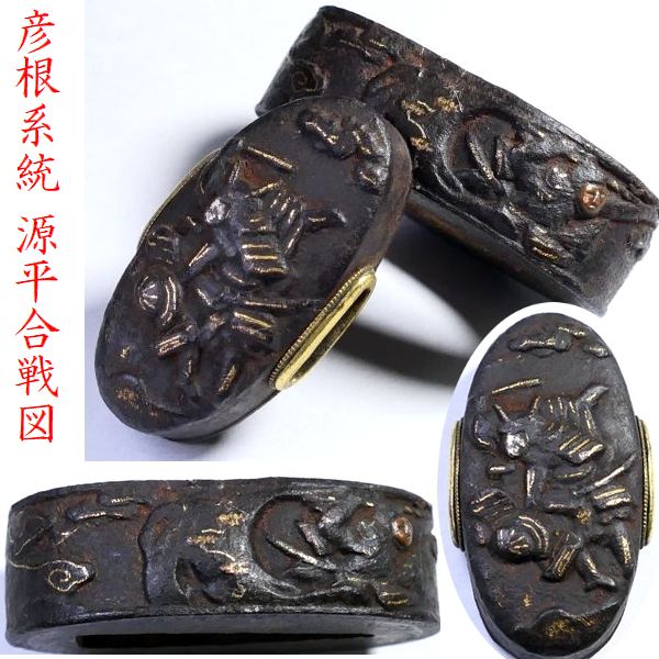 【 恵 #2032 】 彦根系統の優品 「源平合戦図」 鉄地縁頭 金象嵌 力強き細工の一品です 検:鍔/刀剣/刀装具 收藏