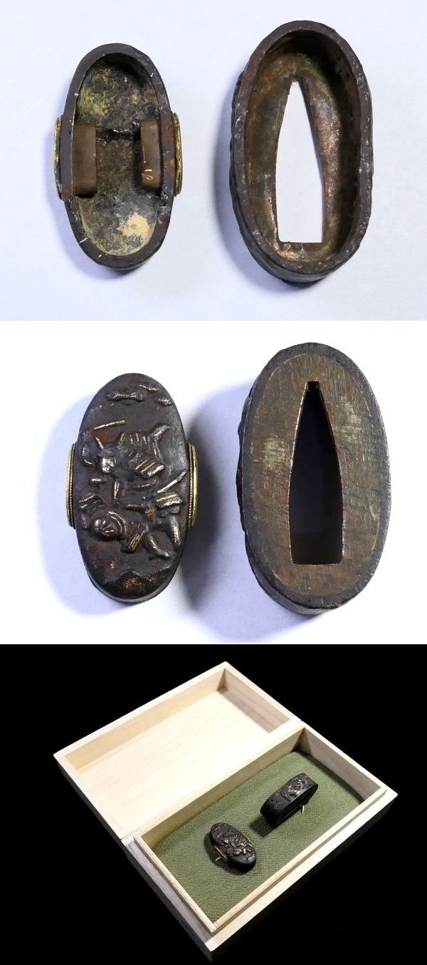 | 商品説明 | ~寸法~ (縁) 約 3.81cm× 約 2.13cm× 約 1.18cm(厚み) (頭) 約 3.36cm× 約 1.68cm× 約 0.73cm(厚み) 良く鍛えられた鉄地に 力強き細工と金象嵌の 源平合戦図が施された一品です。 作行から見て彦根系統の優品と推測しております。 詳しくは画像にてご確認下さい。 この機会に是非手に入れて下さい。 桐箱がございます。 大切にして頂ける方の元へ届けば幸いでございます。 ~状態~ 全体的に見て状態は概ね良好です。 画像にてご確認下さい。 許容範囲内の時代傷みはご理解下さい。 |