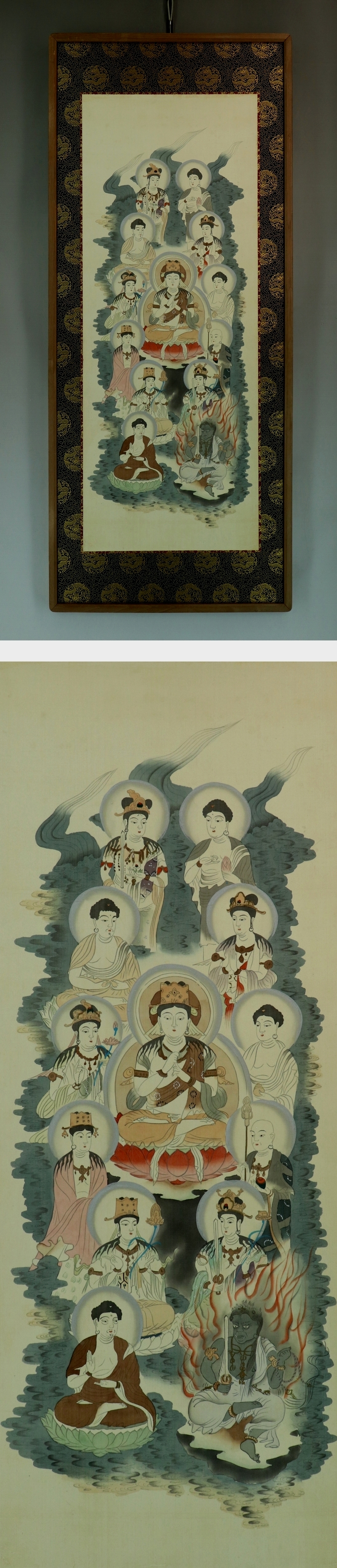 仏画【十三佛】 本紙は、染み、擦れ、ヤケがあります。 表装は、額部に汚れと傷があります。 【サイズ】 作品 横約42cm×縦約109cm 表装 横約58cm×縦約138cm |