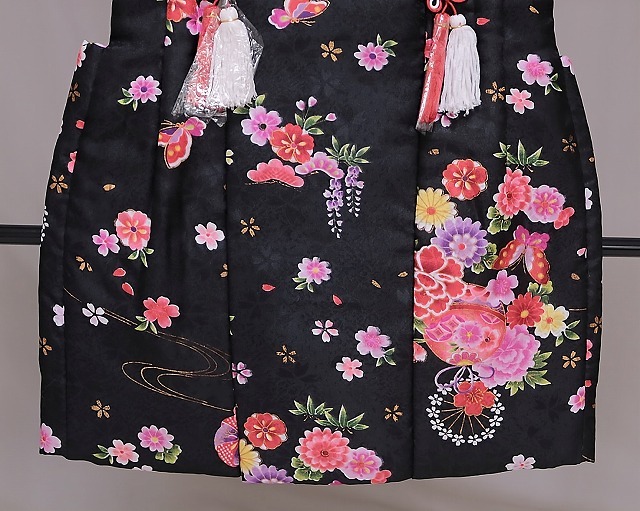 柄などは、花柄地紋の見える黒色地に赤色・白色・ローズ系色・紫色などにて花柄や鈴・蝶の柄があります 流水柄や所々金彩加工も見られます。★