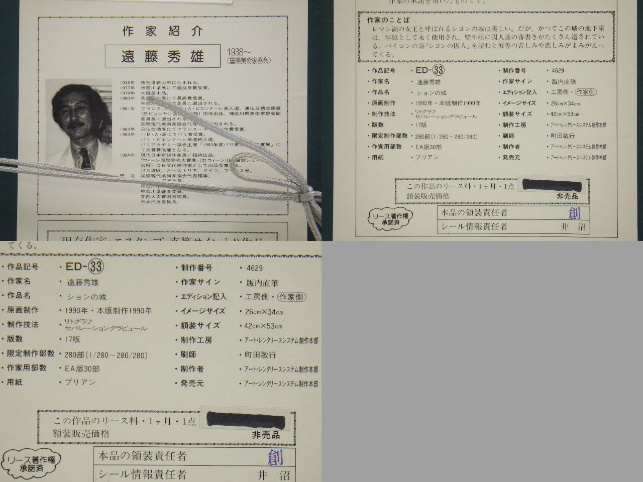 h5B107Z0.2 遠藤 秀雄 リトグラフセパレーショングラビュール 「ションの城」「ラブレードの館」 計2点 收藏