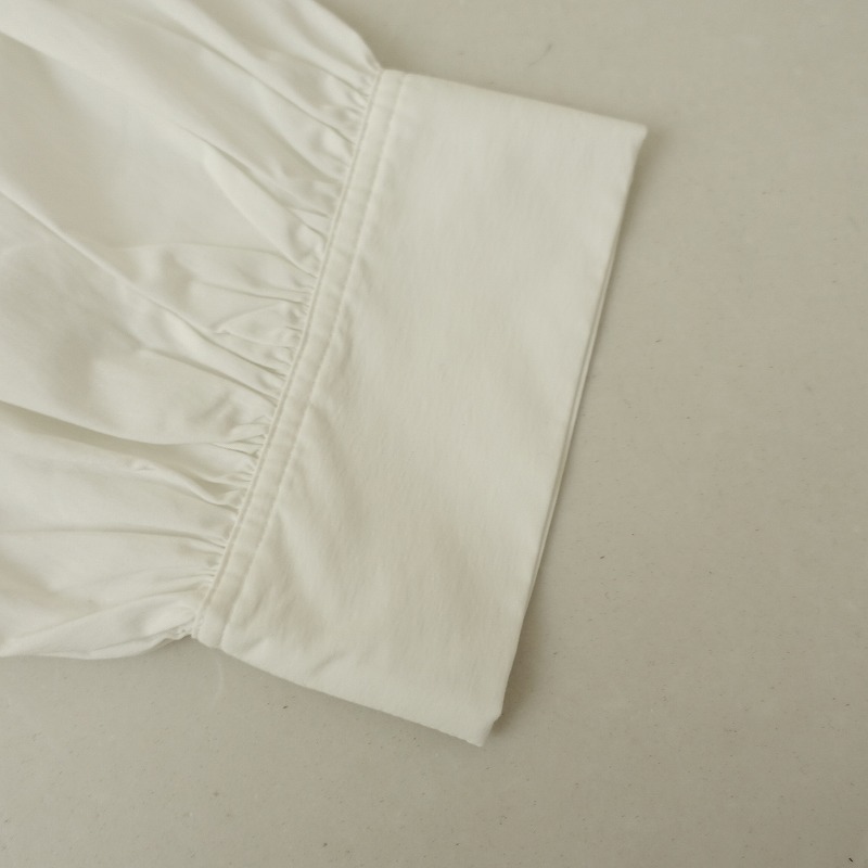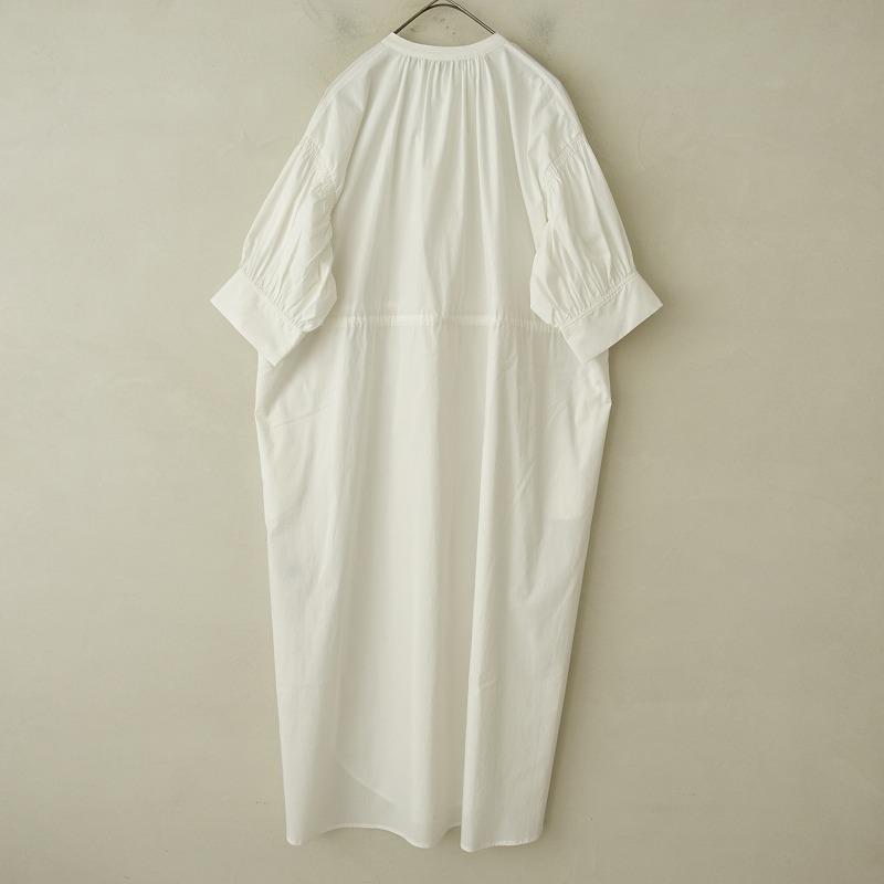 | TOLNERA PRIORITYのバンドカラーギャザーワンピースです。カラーはホワイトで、布帛地です。ネック周り&袖口にギャザー入りで、袖付け周りにはシャーリングゴムギャザーが施されております。首元ボタン&フロント比翼ボタンで着脱でき、裾両サイドに深めのラウンドスリット入りです。ウエストには紐が通っており、腰両サイドにシームポケットがございます。 |