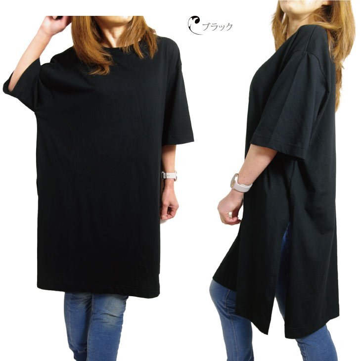 4L~5L 5分袖 半袖 Tシャツ レディース ロング丈 カットソー クルー トップス ブラック 新品 收藏