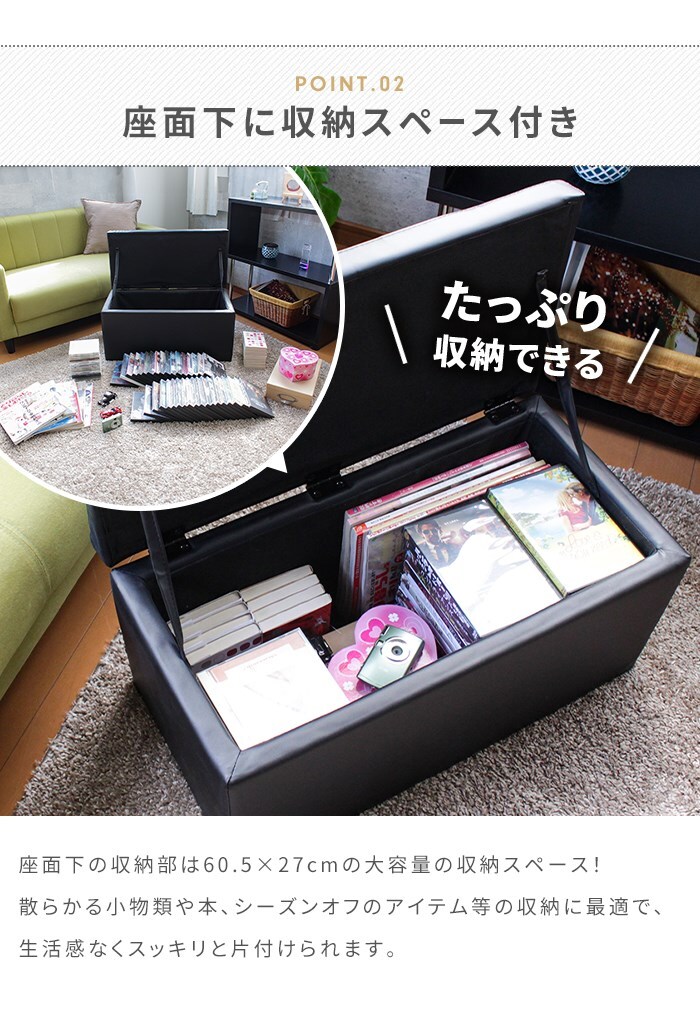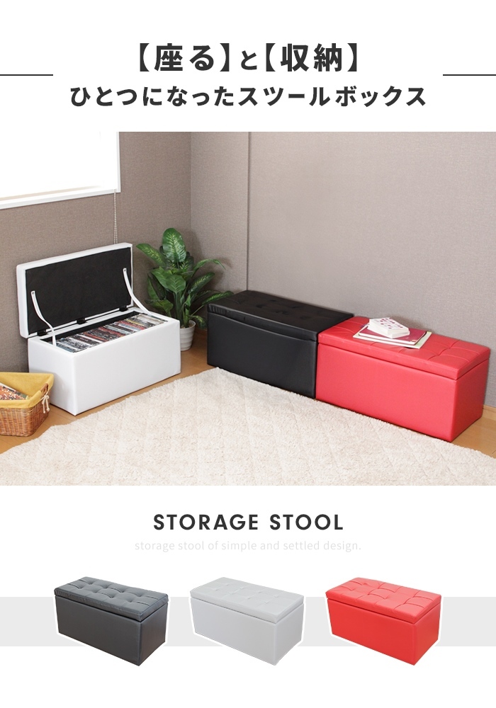 | 座ると収納がひとつになったスツールボックス。 座面の下は収納スペースになっているので、散らかる小物類や本、CD・DVDなどの収納に最適。 合成皮革を採用。撥水性があり、汚れてもサッと拭けるので、お手入れもラクラク。 スツールの底面には小さな足が付いているので、安定性も◎ 色違いを交互に並べてみたり、同シリーズのスツールタイプと合わせてみたり、自分好みのアレンジでお部屋のアクセントになるインテリアとしても大活躍。 |