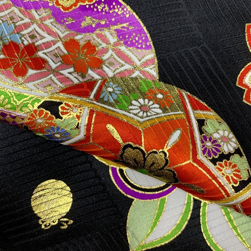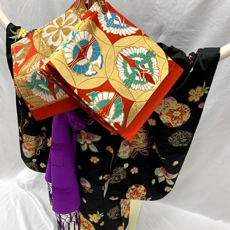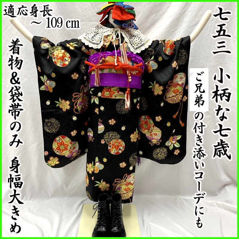 □きものマーチ□七五三 七歳 女児 着物&袋帯(おまけ)&長襦袢 金彩 毬 椿 黒□美品 509ag33 收藏