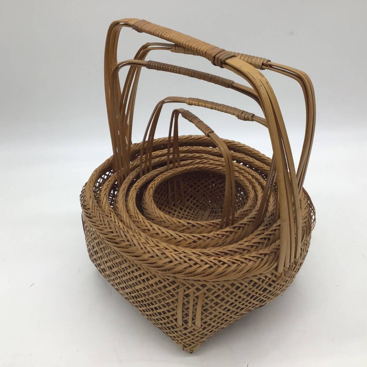 | 商品説明 | ・持ち手付き 竹かご 5個セット バスケット 収納 小物入れ 古民具 竹籠 籠 カゴ インテリア 竹細工。 ・昭和レトロなお品物です。 ・保管によるお品物のやけが見られます。 ・保管による持ち手のほつれが見られます。3枚目の写真にて確認ください。 ・写真にて状態をご判断ください。 |