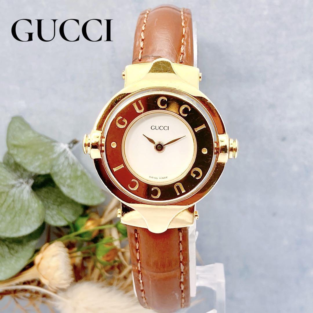 【稼動品】GUCCI ターンフェイス ゴールド レザー 腕時計 レディース グッチ 社外新品ベルト ブラウン 收藏