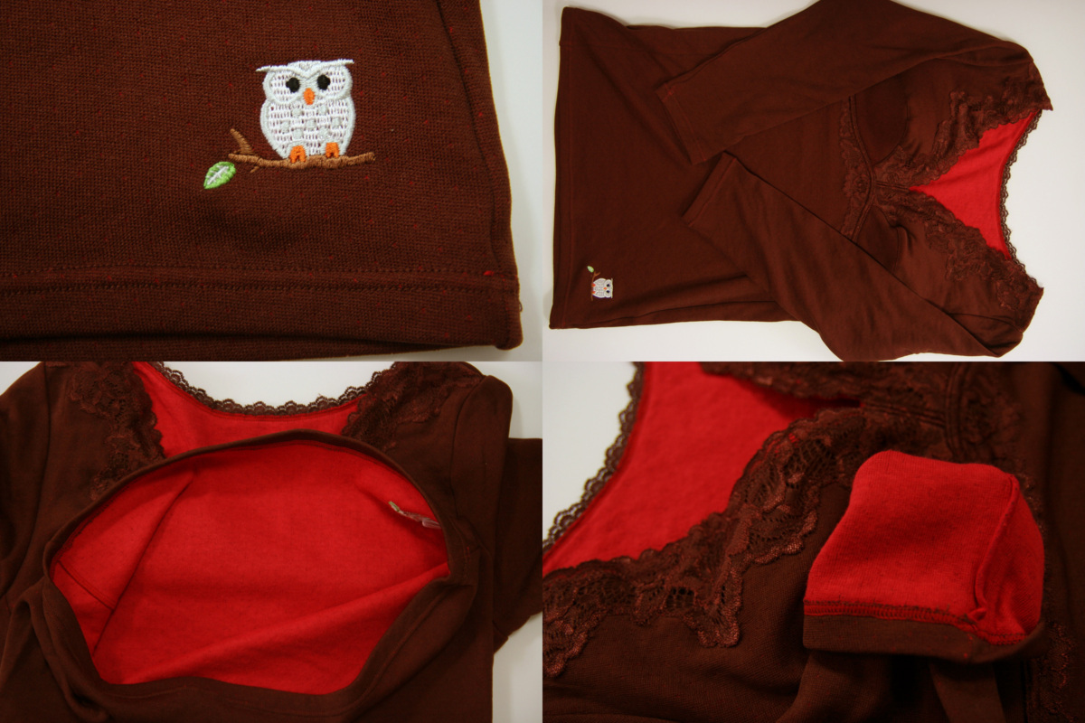 送料無料◆超お得◆2色組◆裏地:綿100%◆袋編み◆赤色縁起&健康肌着◆ふくろう刺繍◆ブラカップ付き長袖インナー(M/ブラウン&パープル) 收藏