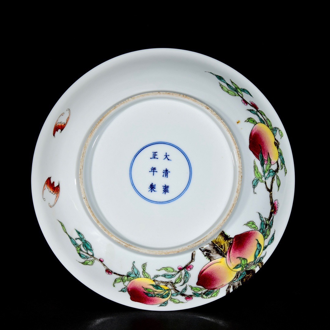 PTA#1236【3.1】中国骨董 人間国宝 磁器【清雍正パステル彩九桃福寿紋皿一対】工芸品 施釉陶 青花磁 陶芸 精美彫 置物 收藏品 收藏